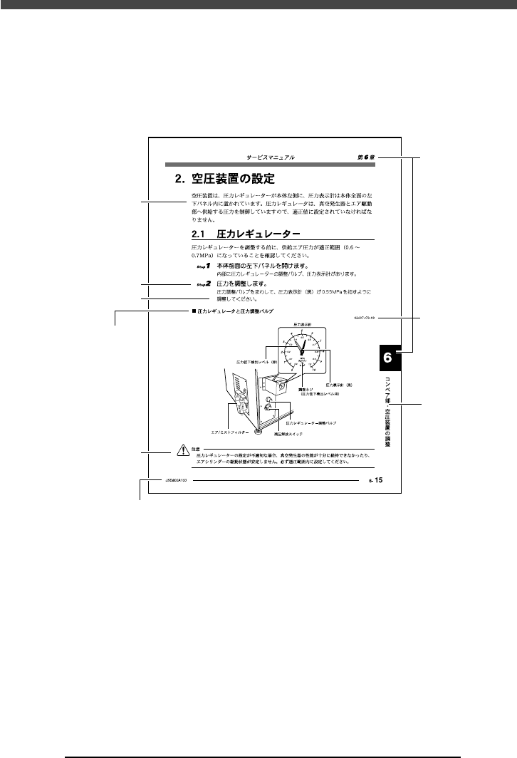 8 JSD8013110 本書について 2 . 各章の内容 第 1 章 点検と保守作業 行っていただきたい日常の点検から定期的な点検について説明しています。 第 2 章 メンテナンス・マネージャーとマシン構成モード マシンの調整やデータの変更を行うためのメンテナンス・マネージャーについて 説明しています。また、マシンの仕様や接続したオプション機器に応じた設定を 行うためのマシン構成モードについても説明しています。 第 3 章 マシンデー…