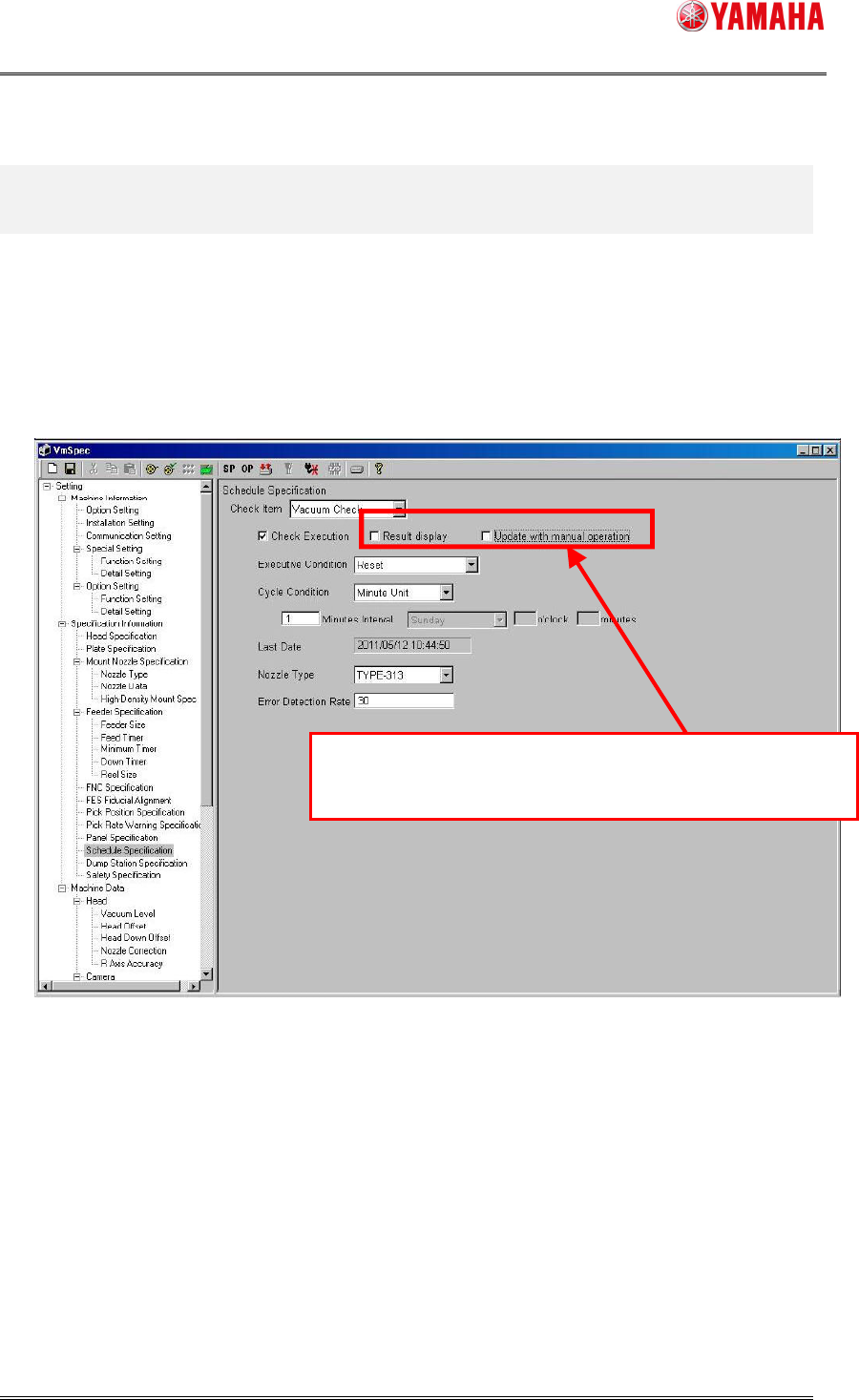 SMT Software Eng ineering Group IM Operations Y AMAHA MOTOR CO., L TD. MD OC-SOFT50138 12/13 4. S ett i ng 4.1. Setting of the Schedule T ask result display function Set [Mach ine (Vm S pec)] - [S peci ficatio n I…