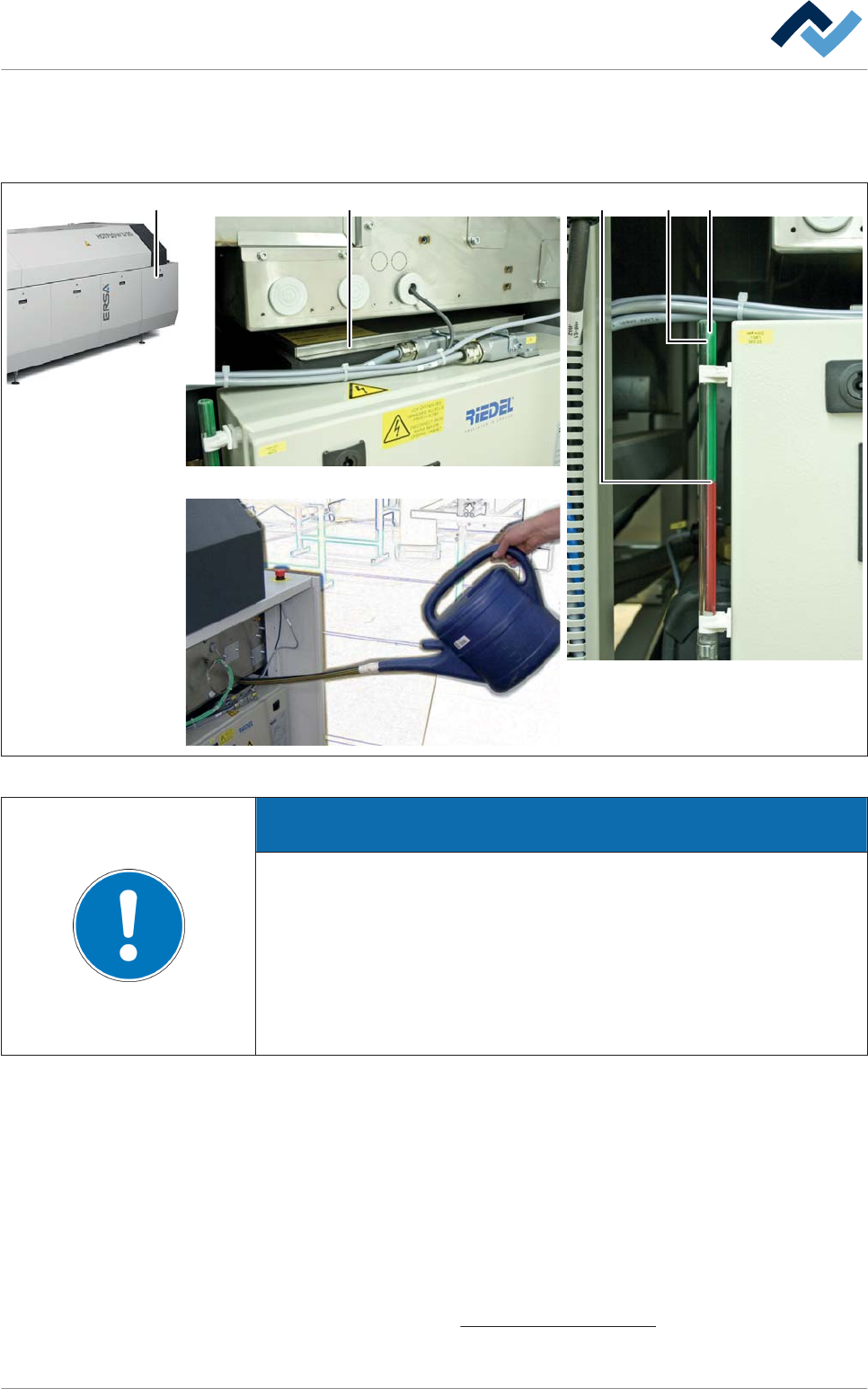 Internes Kühlaggregat: Wasserstand prüfen Das interne Kühlaggregat befindet sich am Auslauf der Maschine. Er ist zugänglich nach dem Entfernen der Abdeckung (2): 2 A3 1 MAX MIN B Abb. 164: Internes Kühlaggregat HINWEIS S…