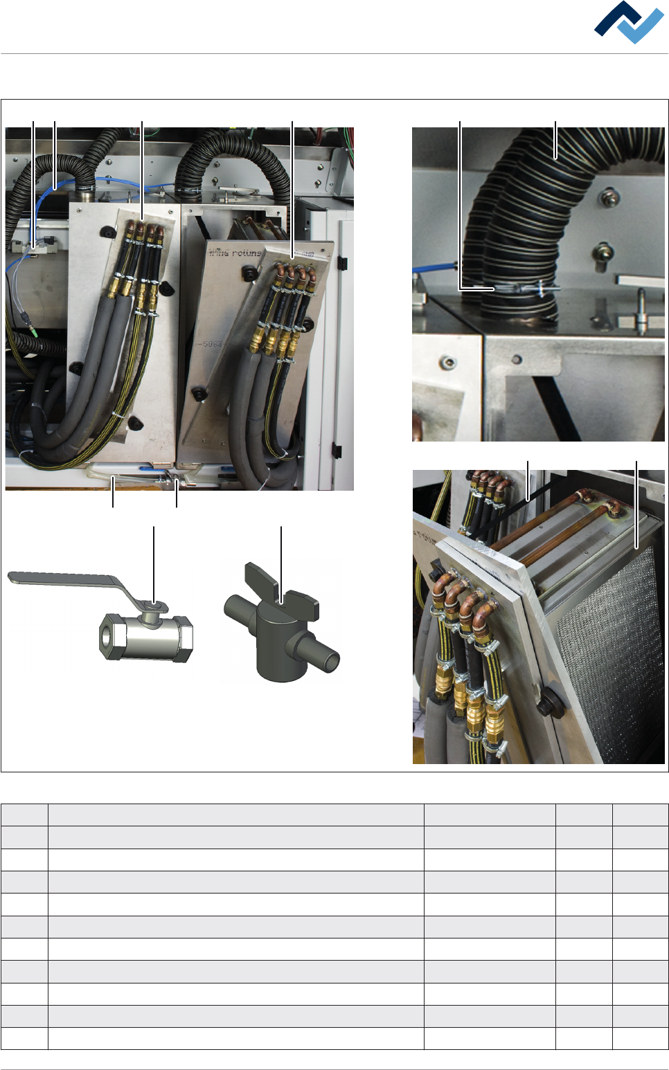 Prozessgasreinigung 7 6 7 1 3 4 1 8 9 2 5 7 Abb. 216: Prozessgasreinigung Pos Benennung Artikelnummer A B 1 Wärmetauscher für Prozessgasreinigung 162586 x 2 Metallfilter, Aluminium 141627 x 3 Schlauch Ø 6 mm x 1 mm für N…