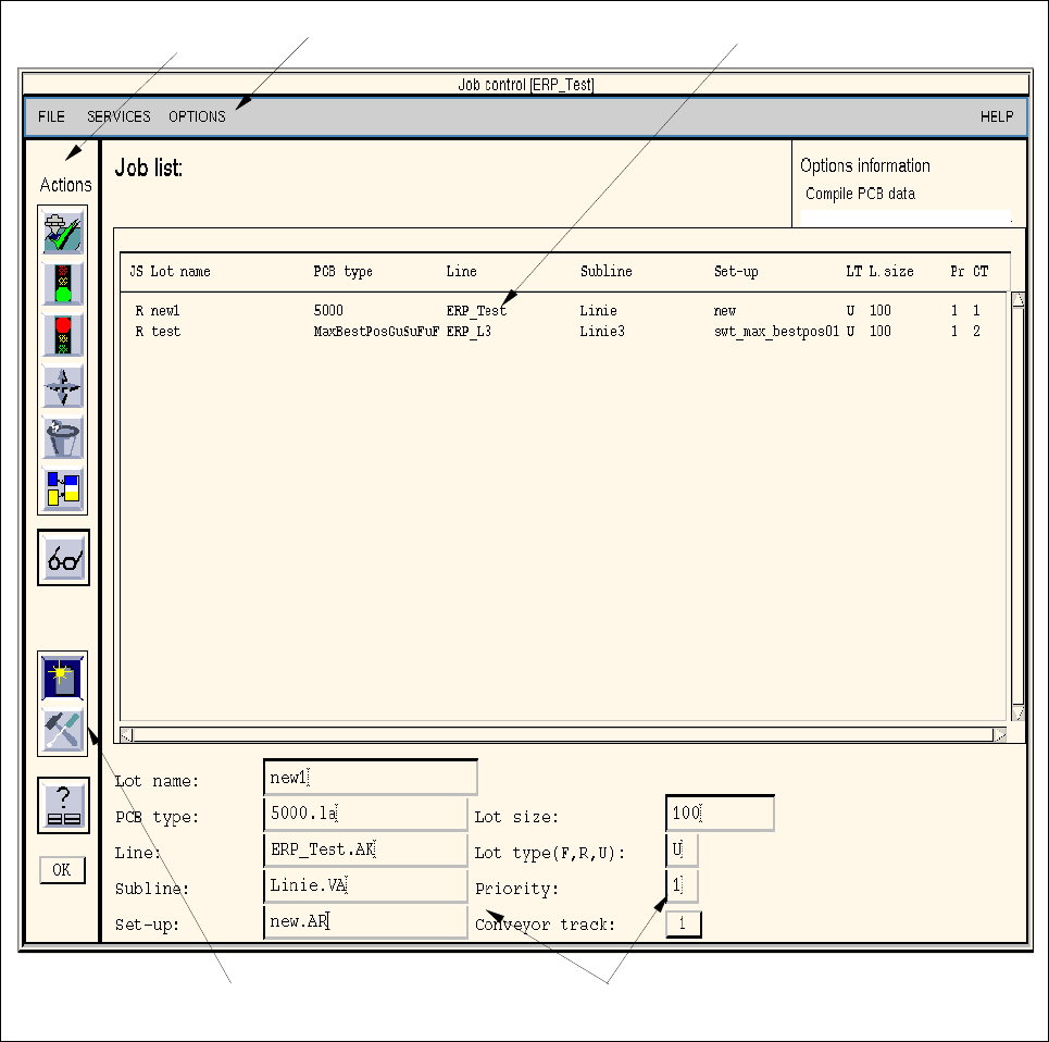 - A job comprises the following entries: PCB type, name of the line or subline, setup, lot type, priority,