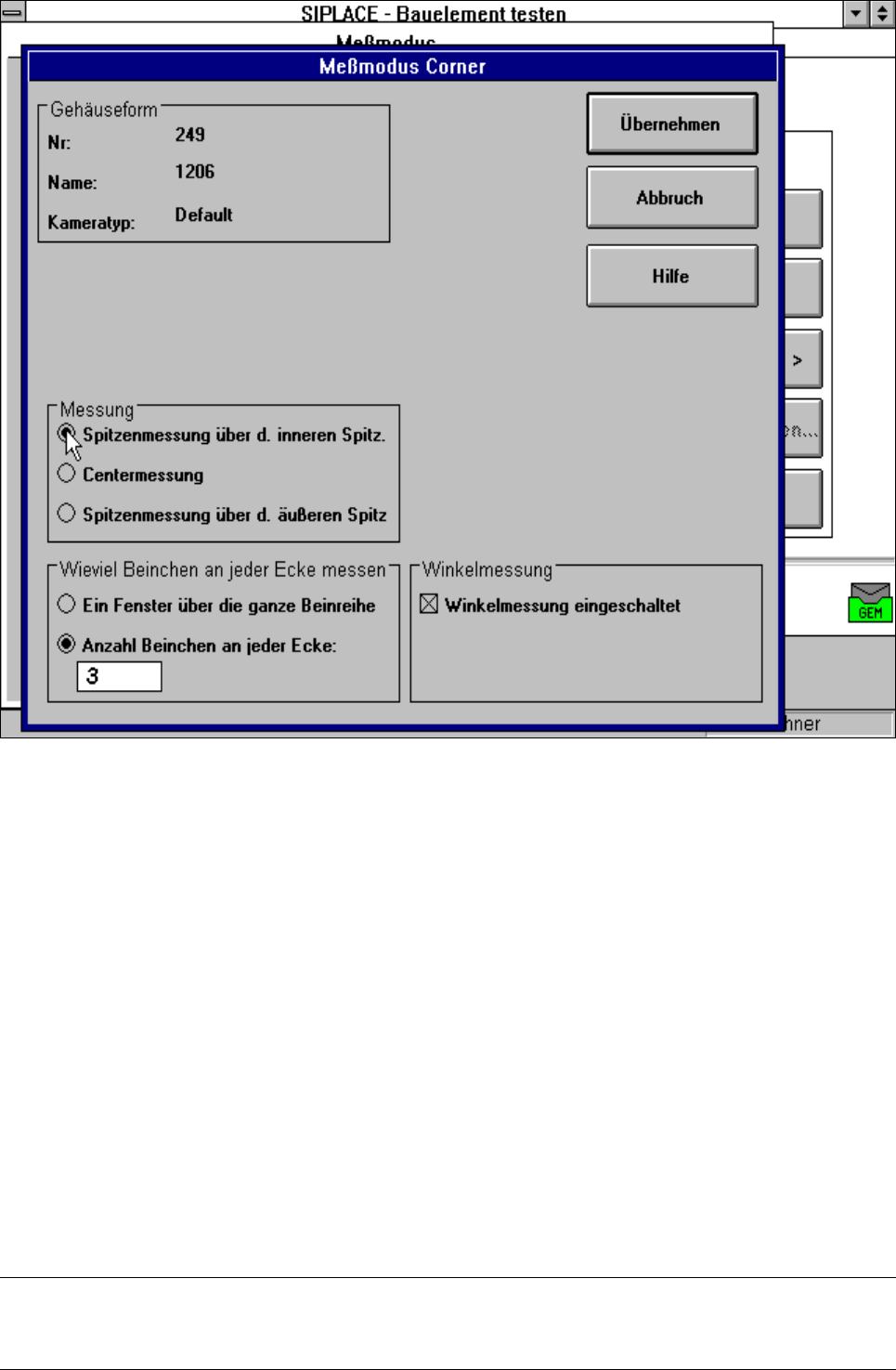 A "Beállítás" kapcsolási felületre való klikkelés után a "Corner" mérési modusban megjelenik