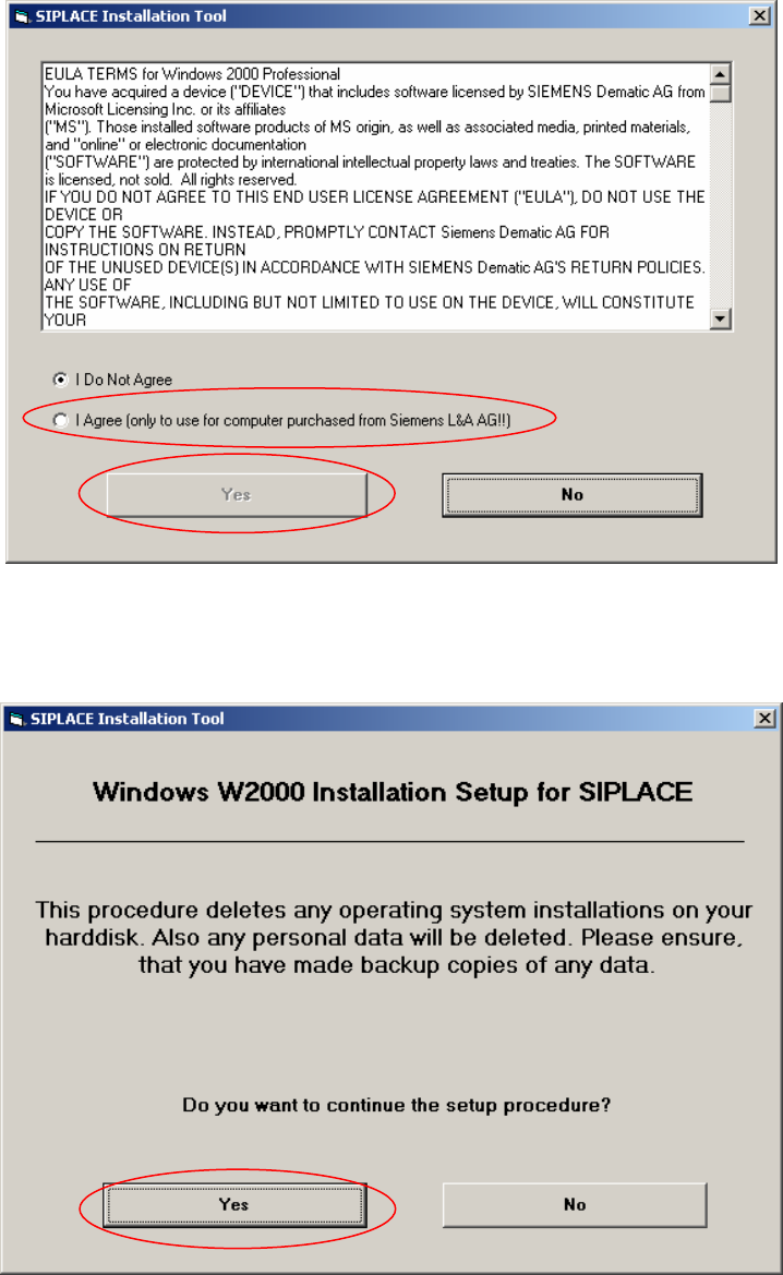 Software Installation Manual Windows 2000 Professional for SIPLACE Computer Edition 03/2006 US + DE 5.1.3 Preparation for the unatte nded setup Windows 2000 Professional Fig. 5-1: License Agreement → Select “ I Agree ” a…