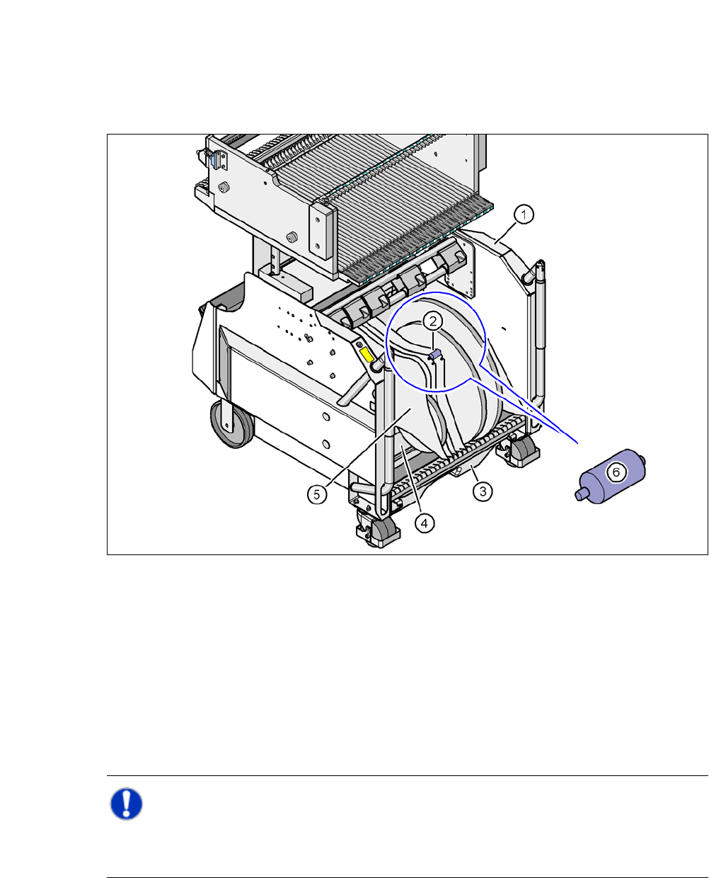 Wait roughly 1 second, until the lock (item 4 in fig. 5.5 - 1) releases the feeder.