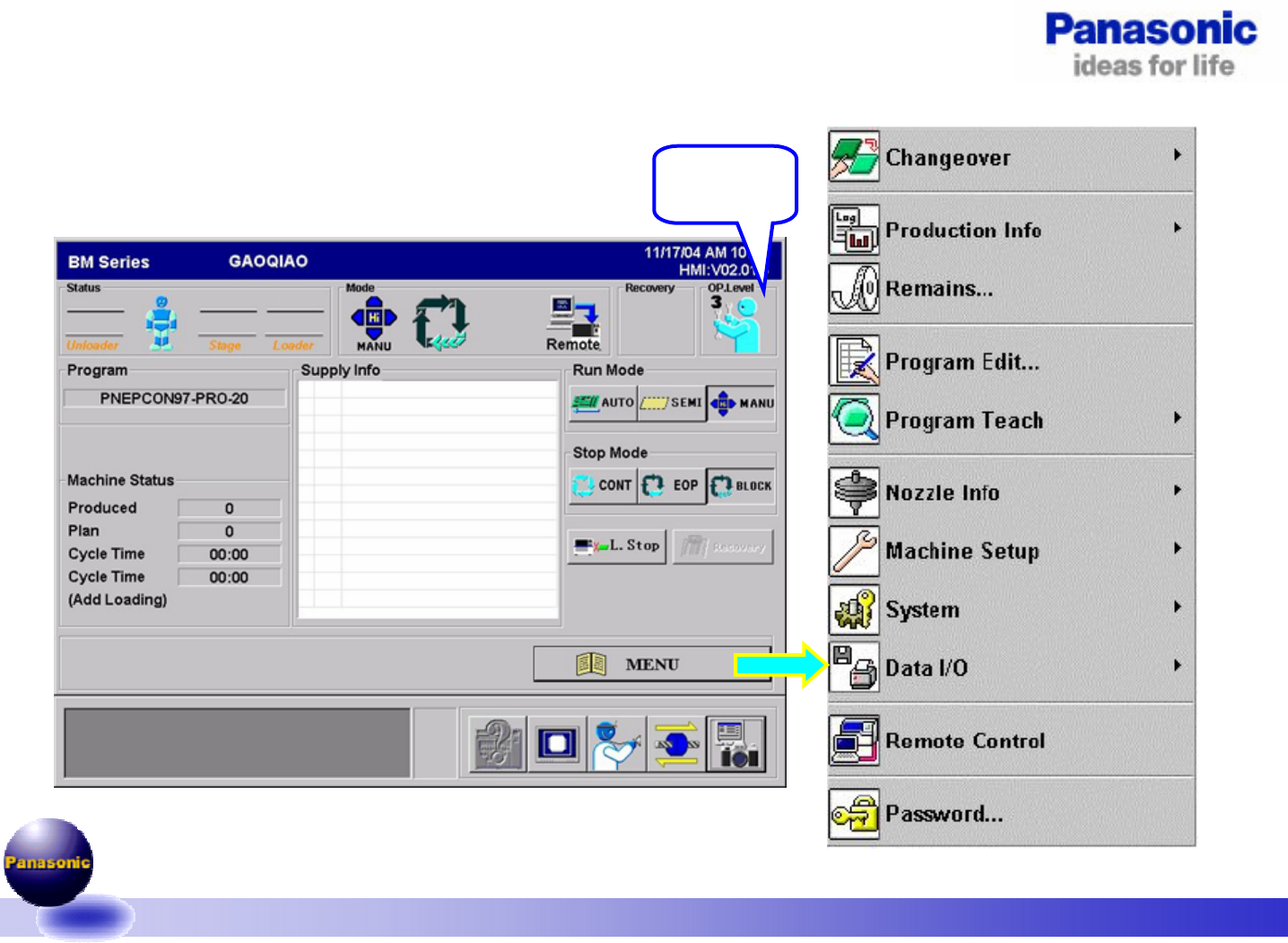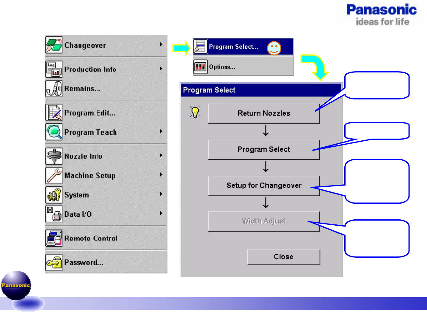 v1.4-061221 26/89 3.程序的切换过程: 将头上吸嘴返 回到吸嘴站。 程序的选择。 头退避到准备 位置,进行生 产前的准备工 作。 按照当前程序 进行轨道的自 动调整。