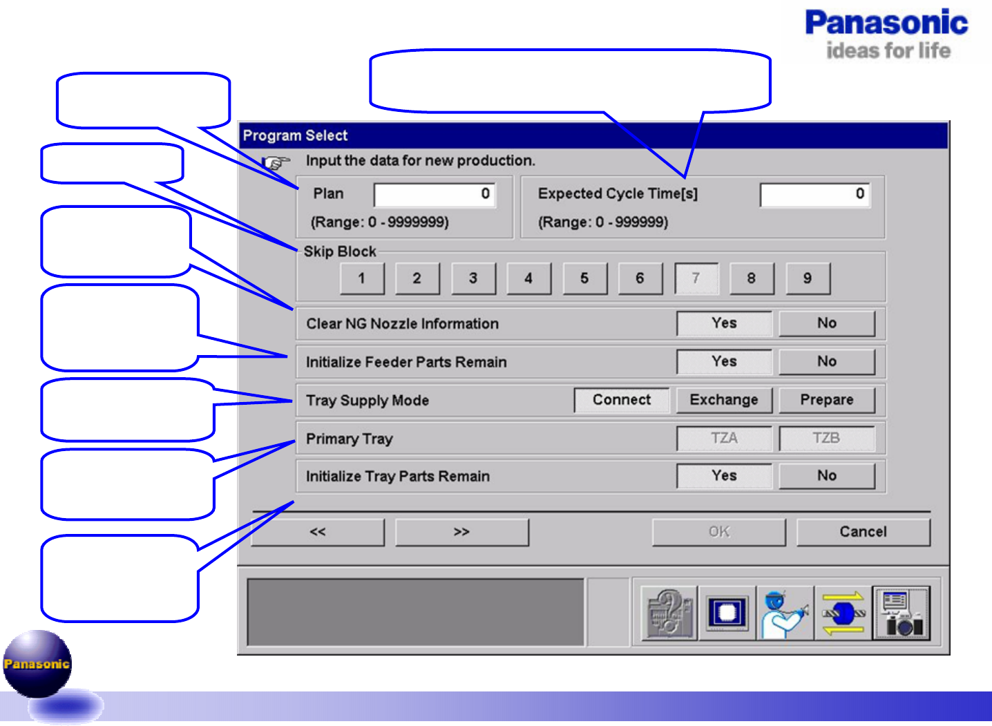 v1.4-061221 29/89 确认各项参数设置是否符合要求: 说明1:托盘动作方式 。 Connect :连续模式,TZA+TZB,当 托盘上元件种类多于40种以上时使用。 Exchange :交换模式,TZA和TZB放置 相同的元件,生产时可交替供料。 Prepare :准备模式,使用TZA或TZB 中的一个部分供料,另一部分可以对 下一个程序的元料进行安装。 说明2:托盘组 。 在交换模式时 :选择常用供料的部分。发生换料时转…