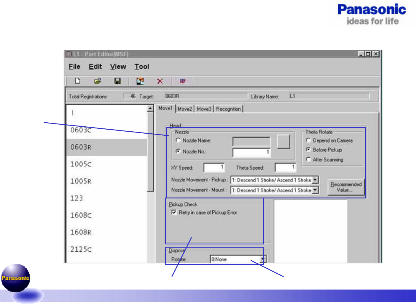 v1.4-061221 45/89 新建部品 库 1:登陆数 表示已登录的数据数(最多能够登录1000个元件) 2:编辑对象 表示当前作为编辑对象而打开的数据代码。 3 : 选 项 卡 [Move1] (动 作 1 ), [Move2] ( 动 作 2) , [Move3] ( 动 作 3) : 设定 每 一元件的机械动作。 [Recongizition](识别) : 设定元件识别用数据。 4: 显示输入时的辅助信息 有提示图象时显示。…