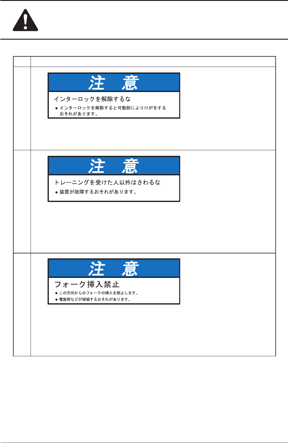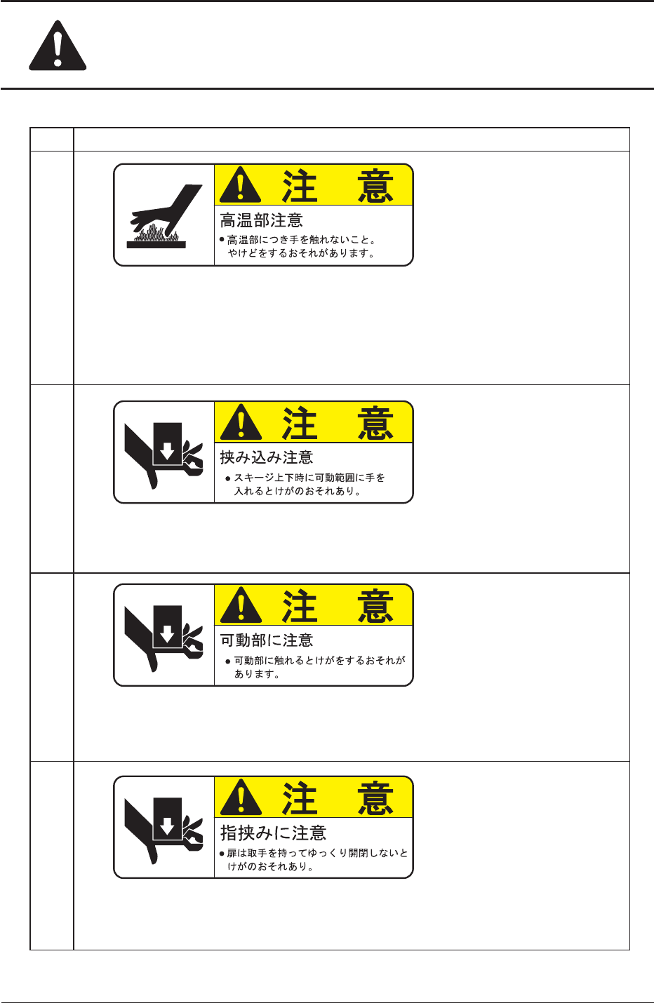 安全にお取扱いいただくために No 警告ラベルと説明 (15) 説 明 可動部に注意してください。 衣類、髪の毛、 ネックレスなどを、可動部にはさまれるおそれがあります。 (16) 説 明 [OPERATION] スイッチを“SETUP”側に設定すると、 開閉扉のインターロッ ク機能が解除され、扉を開けた状態で装置が稼働します。可動部に接触す ると重大な事故になるおそれがあります。 “SETUP”側での運転は、段取時以外使用…