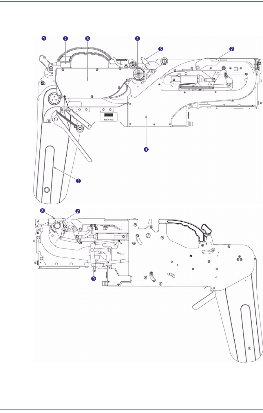 1-4 三星 SM-Series 气动带式喂料器的操作手册 1.1.4. 喂料器底座 喂料器底座的前面下端装有喂料器 基线板, 给 SM 喂料器供给电源, 并且接受输入 及输出信号。 还有喂料器基线板下方装 有与缝数相同数量的气接头, 给喂料器 提供 空压。 图 1.4 喂料器底座的外观 1: 喂料器控制面板 2: 气接头 No. Name No. Name No. Name 1 夹钳杆 2 状态显示部 3 塑料箱部 4 Drain 部…