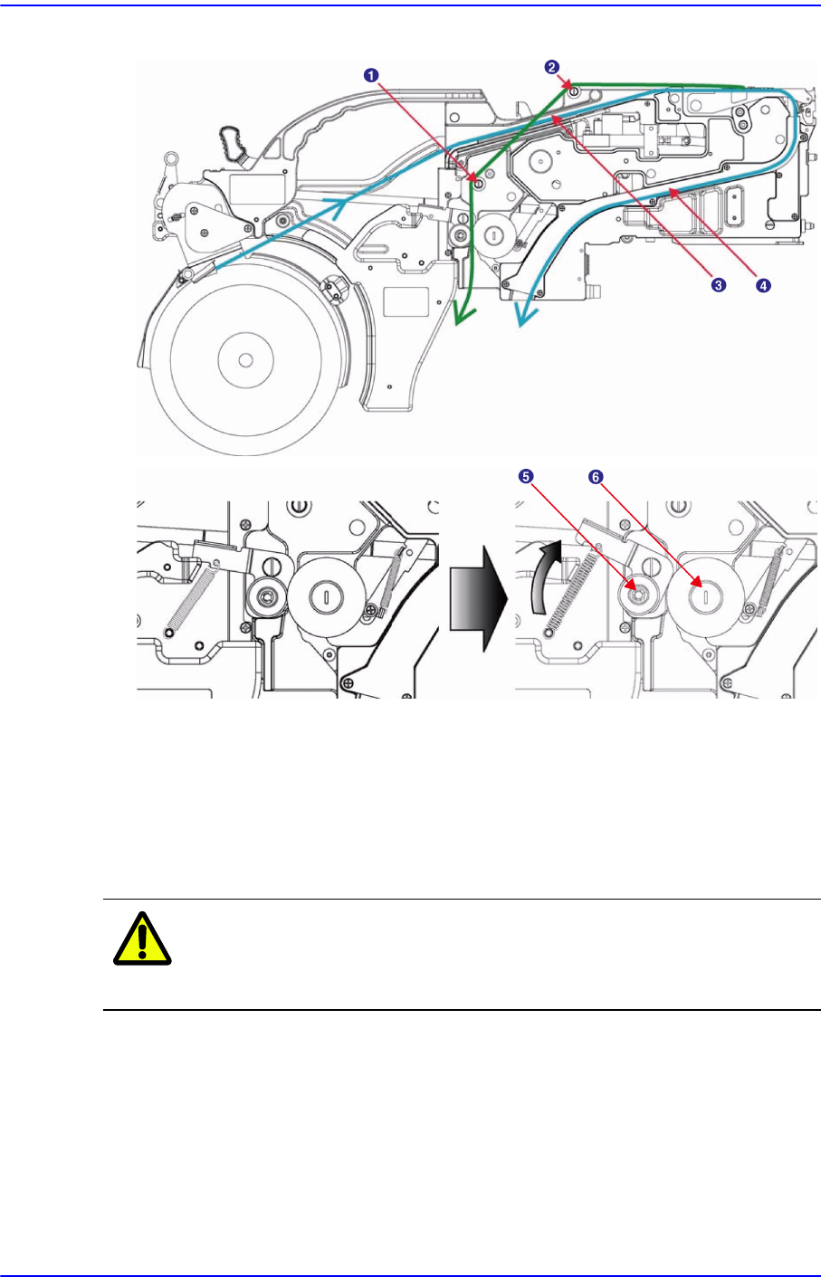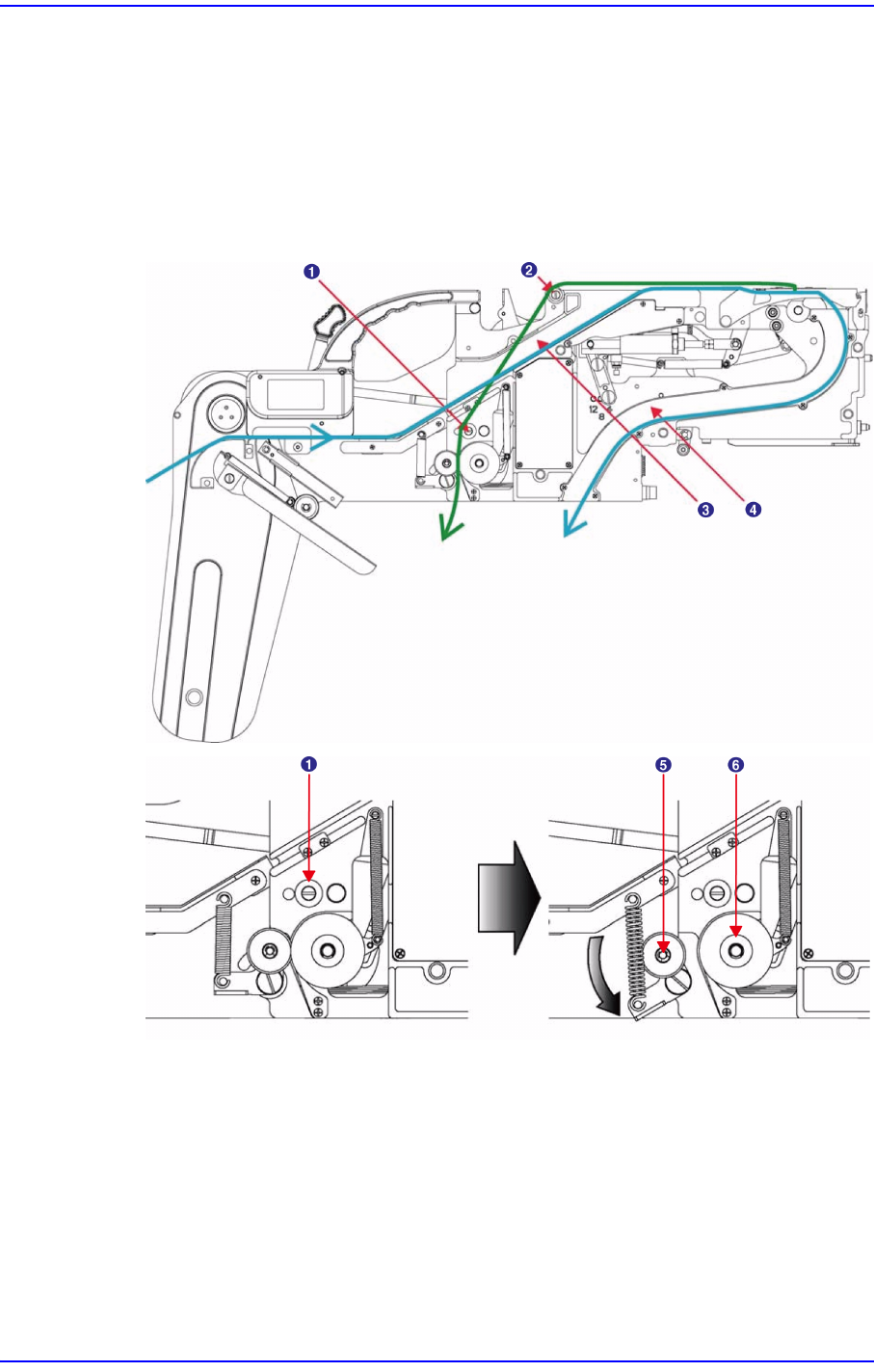 2-12 三星 SM-Series 气动带式喂料器的操作手册 图 2.15 上盖卷带在辊轮与齿轮之间的 固定方法 (SM 8mm 带式喂料器 ) 1: 辊轮 B 2: 辊轮 A 3: 槽 A 4: 槽 B 5: 成形 (Forming) 齿轮 6: 排出齿轮 注 意 盖卷带固定时, 成形 (Forming) 齿轮受到弹簧支撑, 注意 避免手 指伸进成形齿轮与排出齿轮 之间。