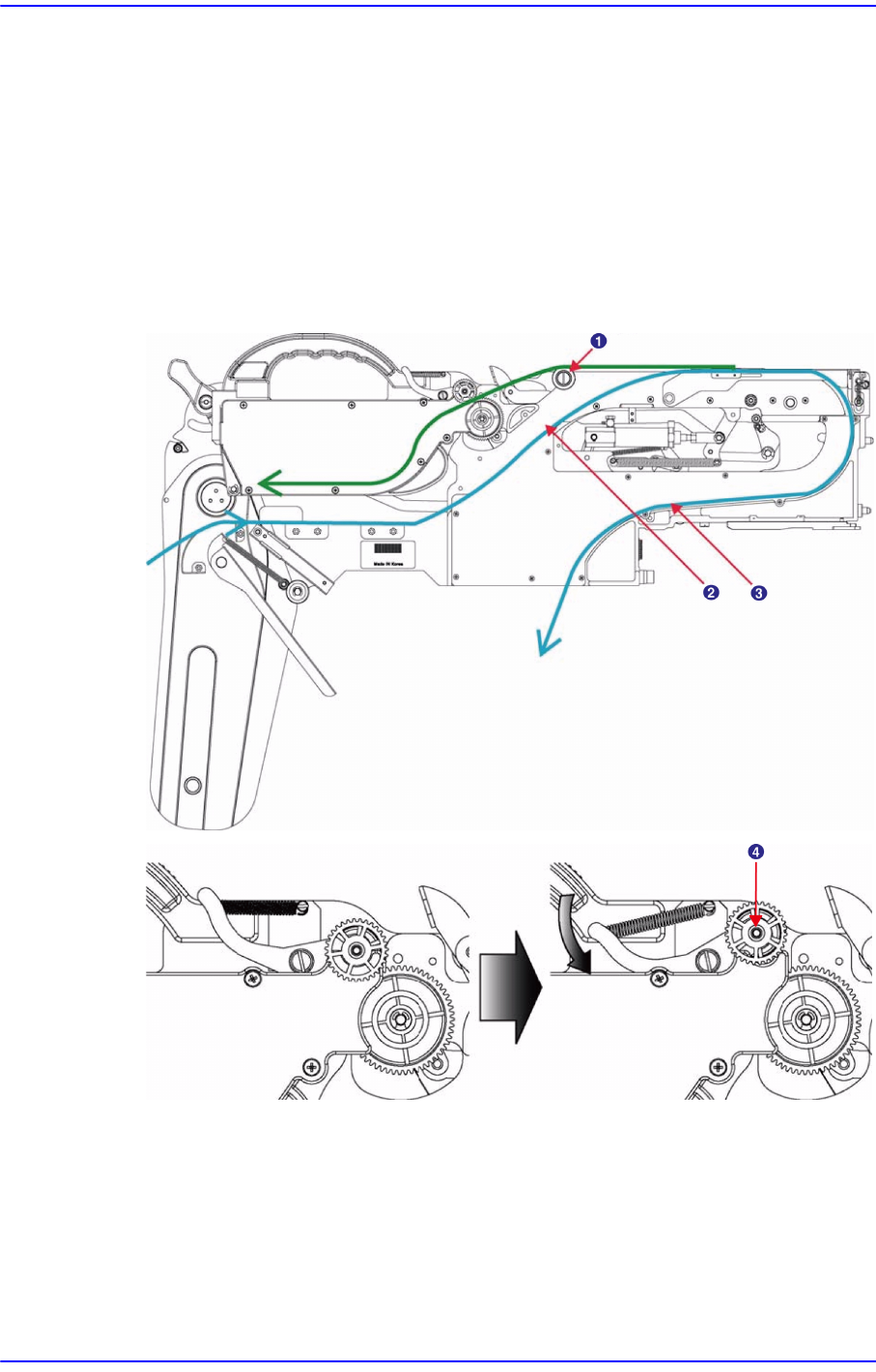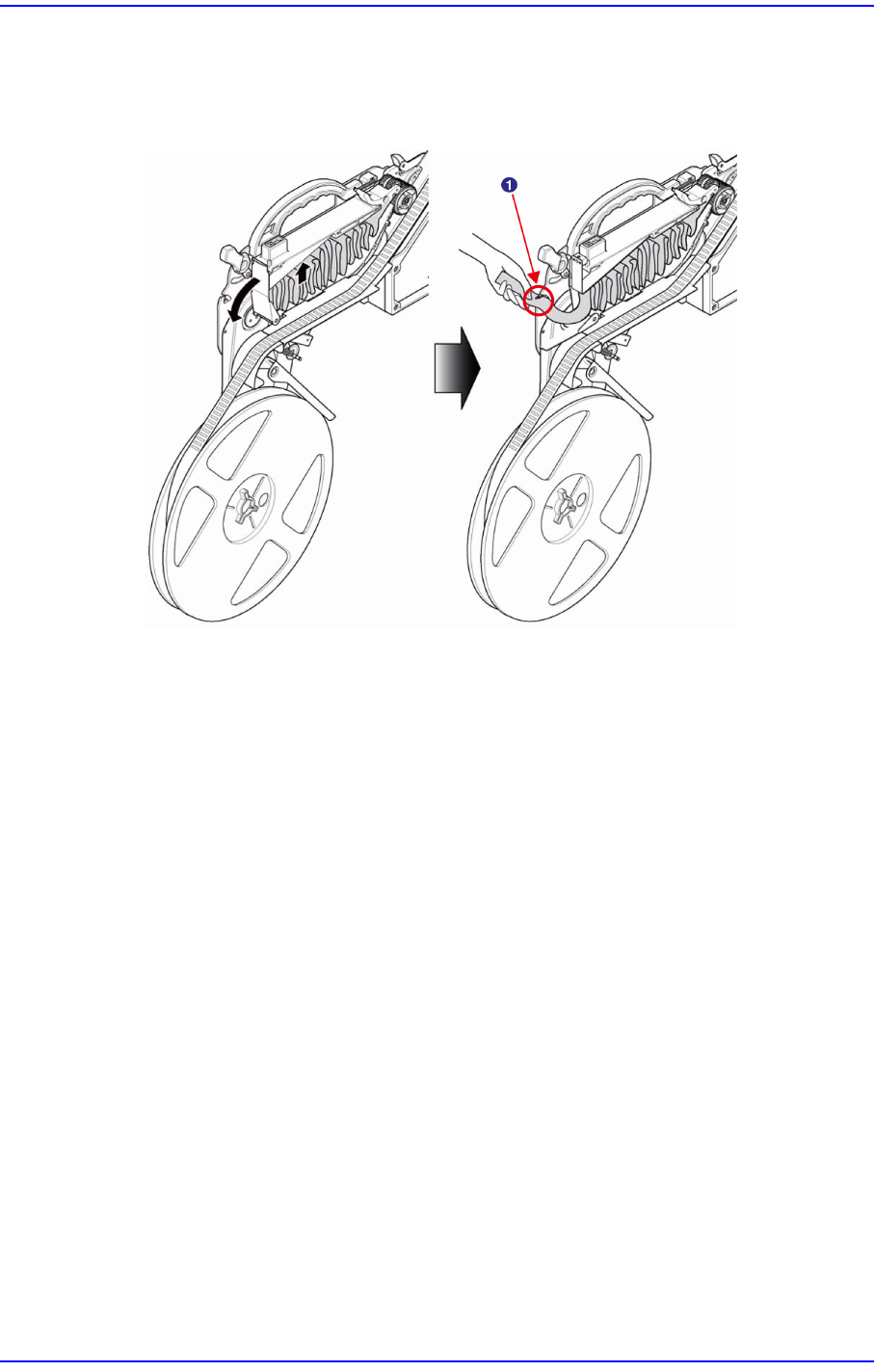 在 SM 12mm~16mm 带式喂料器中,把料带分离插槽中抽出的上盖卷带挂在辊