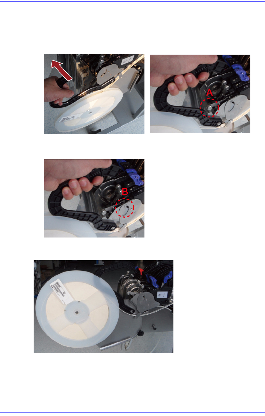 1. 如下图所示用手握住料盘制动器后朝箭头方向推动并举升A部位。