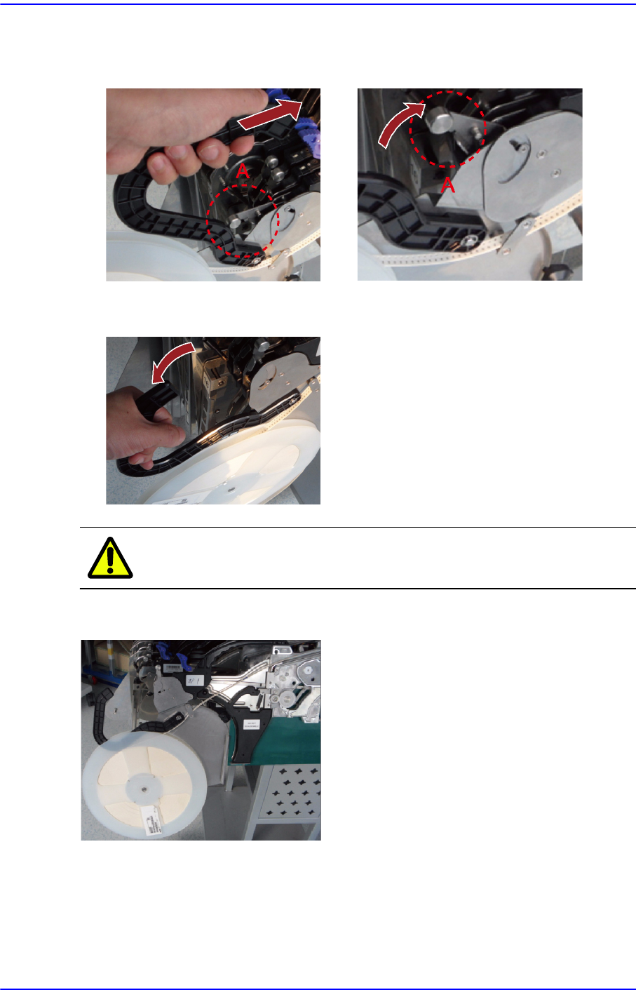 1. 如下图所示用手握住料盘制动器后朝箭头方向举起,请注意避免接触到 A 部位。