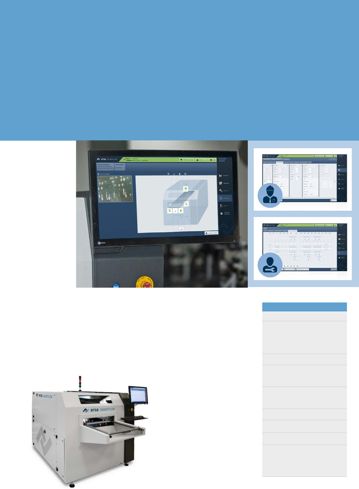 ERSASOF T 5 具有 面向用户的菜单导 航功能和 PIP 功能, 实现了最优概览 易用的选择焊 即插即用 基本配置 3 轴定位系统 印刷电路板万用柜 (可用于最 大尺寸为 508 x 508 mm (20 x 20“) 的印刷电路板) 高精度助焊剂喷射系统 焊接模块 (带易维护的电磁焊 料泵) 便捷式 PC 控制 (带触摸式监 视器) ERSASOFT 5 操作软件 排气监测 操作状态显示 过…