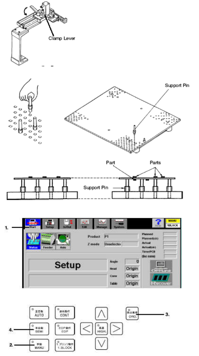 七 . 生 产程序 : ( 一 ) 1. 切换成 Semi 状态 . 2. 试旋转 Head 测试动作情形 . 3. 使用 mount pos. check 确认装着点是否正确 . 4. 确认无误后 , 即可切换成 AUT O 状态 . ( 二 ) 1. 于 AUT O 之状态下 , 先以 1 Block 装着测试 . 2. 使用 mount pos. check 确认装着点是否正确 . 3. 确认无误后 , 即可切为 CONT 生产 …