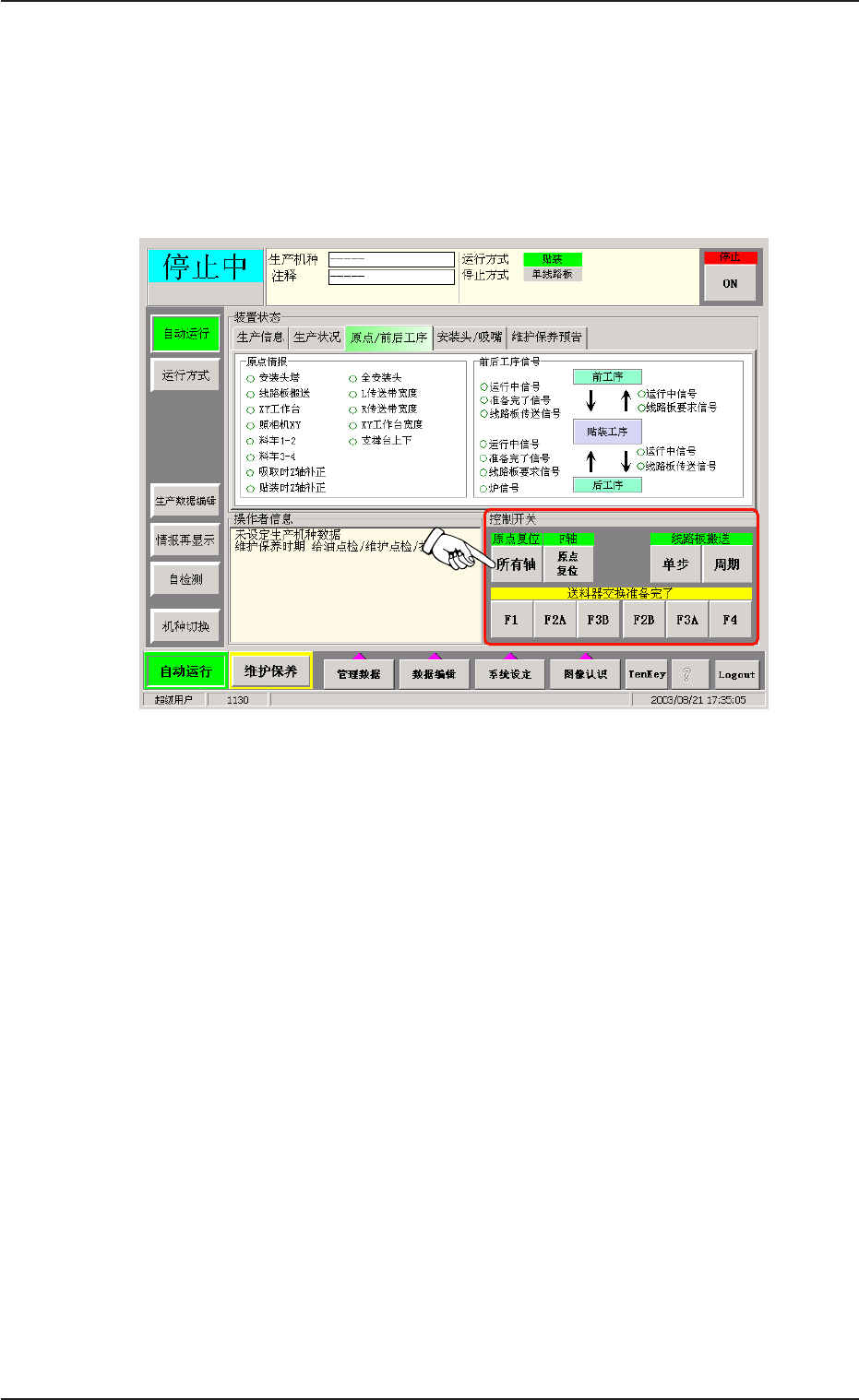 (1) 按前操作台的[STOP]按钮,暂停生产。