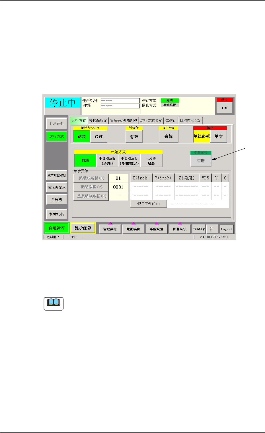 [ 中断] 按钮,生产运行被中断。