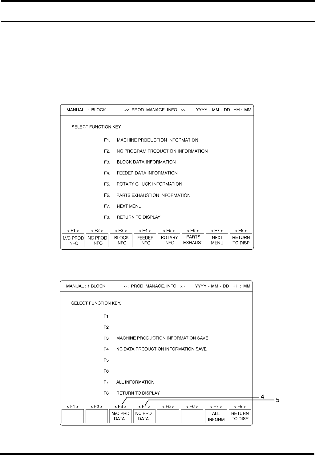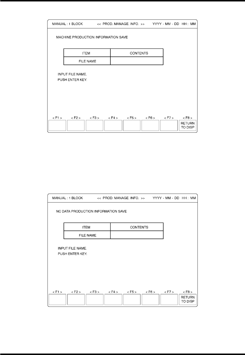 AVK3 参考手册 5.7 保存生产管理信息到软盘 4. 保存设备信息。 按“ F3 ”( M/C PRD DATA[M/C 生产数据 ] )。 (1) 输入文件名并按“ ENTER ” ( 回车 ) 键。 (2) 设备生产管理信息存储到软盘。 设备信息以文本形式存储。 能使用个人计算机里的记事本或电子数据表格等软件来编辑、分析和改变信息。 5. 保存 NC 信息 按“ F4 ”( NC PRD DATA[NC 生产数据 ]…