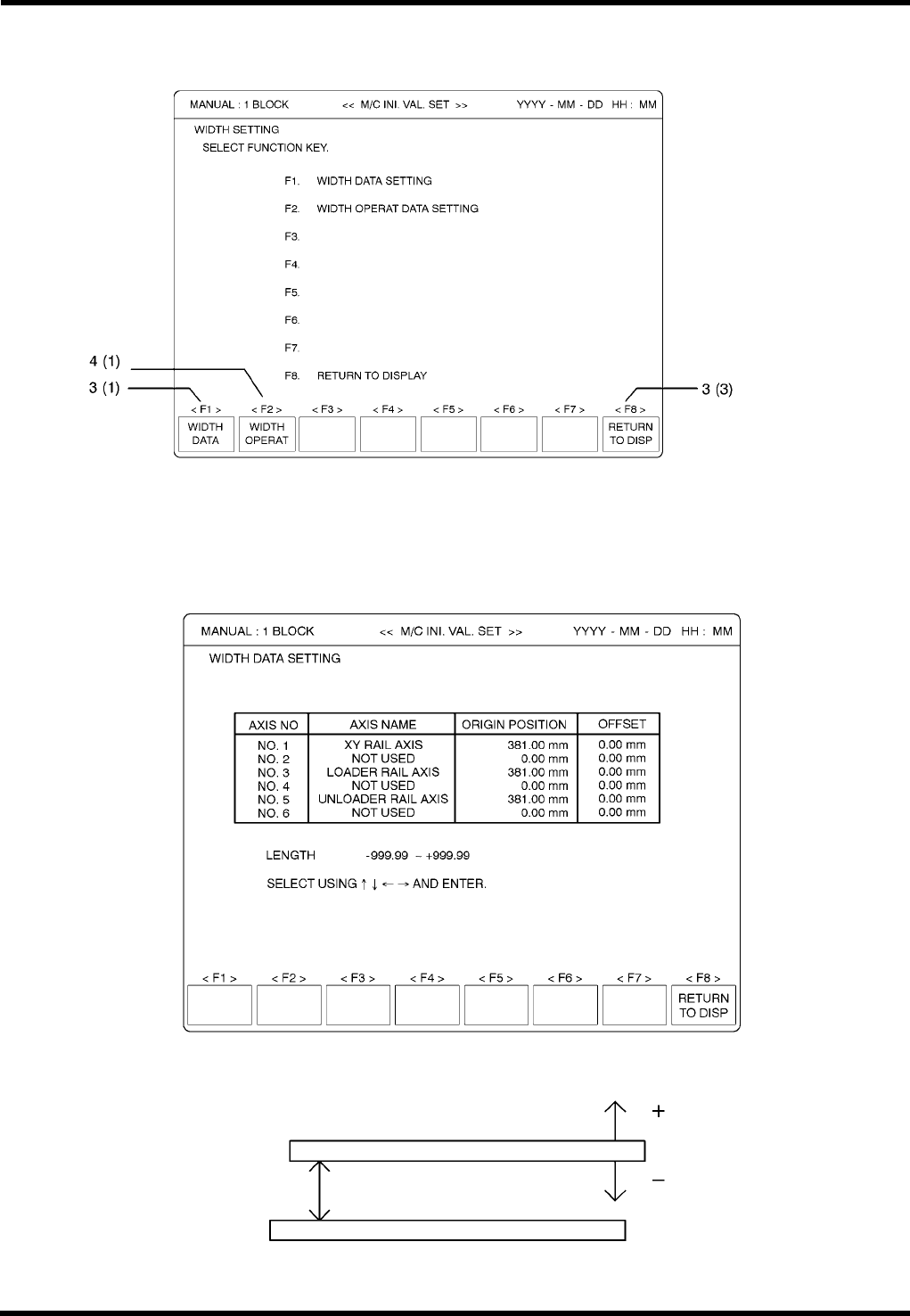 AVK3 参考手册 6.2 初始状态设定 ( 运行状态 ) 轨道宽度自动控制 ( 选购 ) 的设定步骤 4. 1. 按“ F5 ” (WIDTH SETING[ 宽度设定 ]) 。 2. 设定轨道宽度自动控制数据和轨道宽度自动控制状态。 3. 设定轨道宽度自动控制数据。 (1) 按“ F1 ” (WIDTH DATA[ 宽度数据 ]) 。 (2) 输入原点位置和补偿值。 (3) 当完成设定后,按“ F8 ” (RETURN TO D…