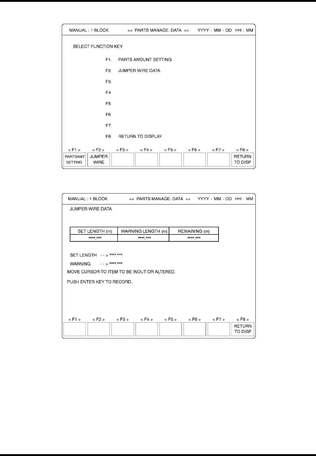 AVK3 参考手册 3.5 设定元件剩余量 2. 按“ F2 ”( JUMP WIRE[ 跳线 ] )。 3. 输入跳线长度和警告长度。 = 提示 = 如果不设定跳线长度和警告长度,将不会给出跳线耗尽警告的信息。 D77RCC-33-190-A0 3.5-3