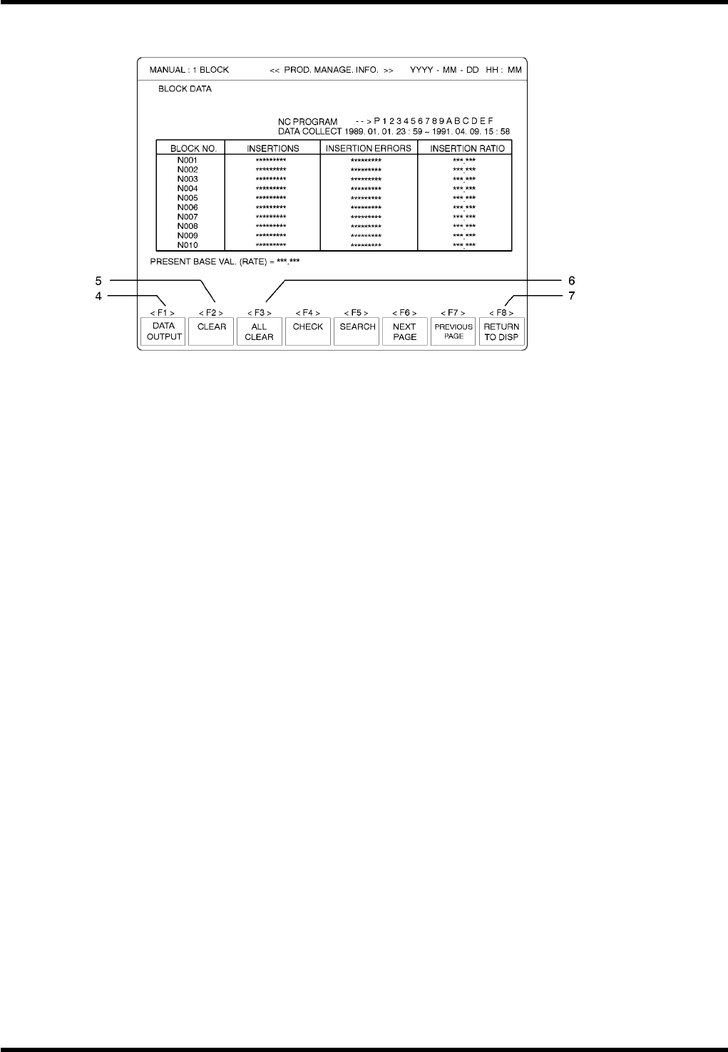 AVK3 参考手册 5.2 NC 数据的区段信息 3. 调用区段数据屏幕 按“ F3 ” (BLOCK DATA[ 区段数据 ]) 。 = 提示 = 不符合标准插入率的区段会显示醒目红色。 可以通过按“ F7 ” (PREVlOUS PAGE[ 前一页 ]) 或“ F6 ” (NEXT PAGE[ 下一页 ]) 使显示 屏上下翻页来寻找屏幕上尚未出现的 NC 数据。 如果不打印或不清除数据,转到第 7 步。 4. 打印数据。…
