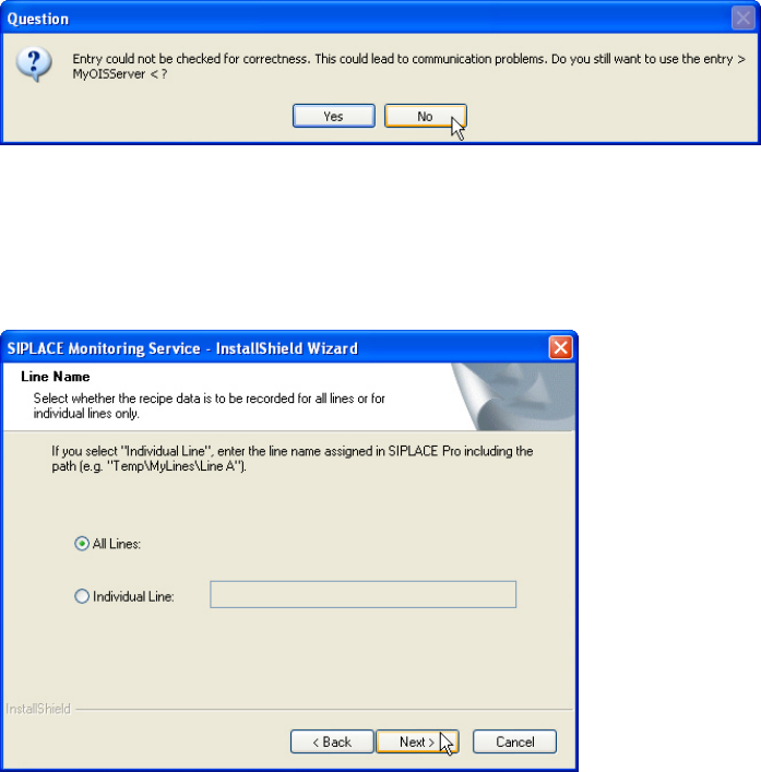 OIS 10.1 / Installation Manual Ausgabe 11/2012 Edition If the connection cannot be checked, the following q uestion is displayed. Figure 3-14: Connection cannot be checked ► Click No and check your e ntry again. ► Click …