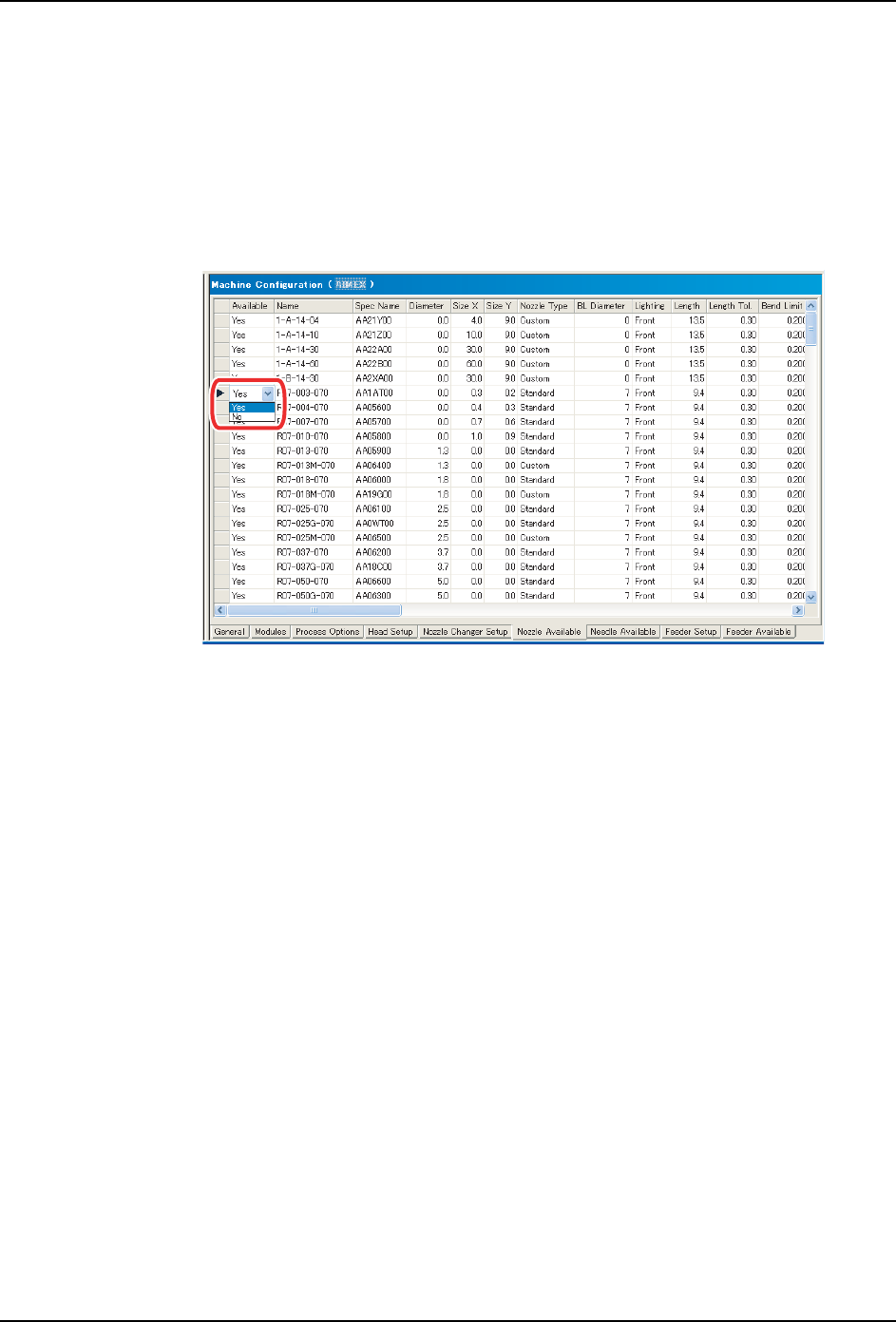 2. 双击目标吸嘴 [Available] 栏,显示下拉列表。请将机器中能够使用的吸嘴设定为
