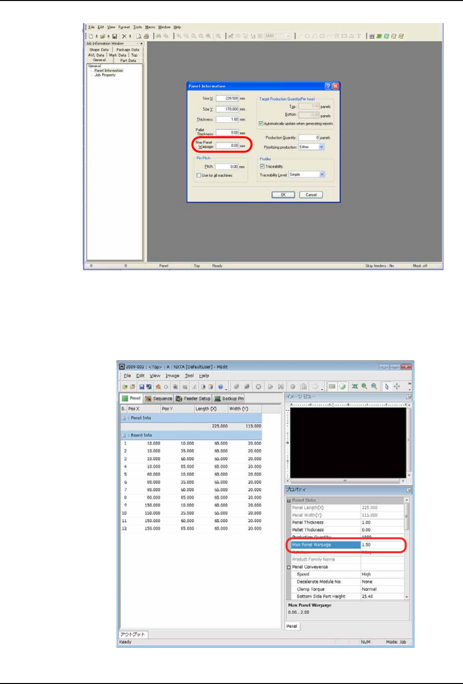 2. Job 编制器 PRG-NXTS-009S1 98 NXT 系列 编程手册 在 MEdit 中进行设定时 1. 在 MEdit 中打开 Job。 (详细内容请参照 "5.1 MEdit"。 ) 2. 选 择 [ 电路板 ] 标签页 。在 [ 属性 ] 窗格的 [Max Panel Warpage ] 中输入电路 板的最大 翘曲量。 · 设置范围:0.00 ~ 2.00 mm,初 始值:0.00 mm ( 不进行…