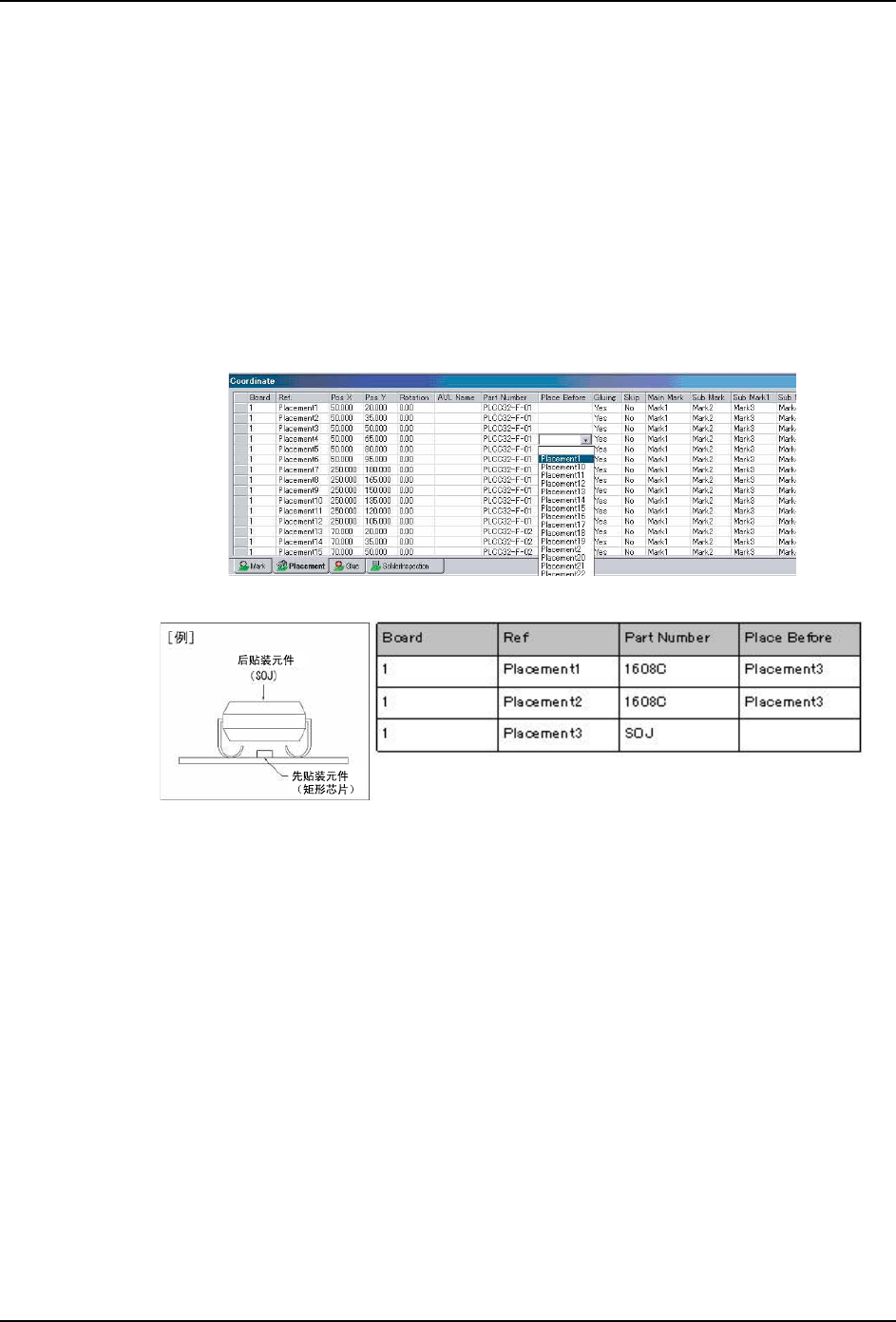 e. 请确认 [Coordinate] 列表的已选元件的 [Place Before] 数据的选择元件列表显示