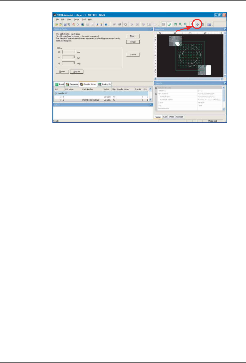 PRG-NXTS-009S1 5. 其他的应用 NXT 系列 编程手册 293 14.通过所显示的图像 检查 X-/Y- 方向上的吸取位置 。如果需要移动吸 取位置,请单击定位 按钮 (带有 四个箭头的按钮 ) , 然后在图形图像中 单击将要执行吸取的 位置 ([Offset ] 数值将自动更改) 。 15.如果元件吸取位置 正确,请单击 [Next]。 16.显示第二个指定的凹槽。单击 [Acquire] 获取料盘中第二个指定凹槽中 …