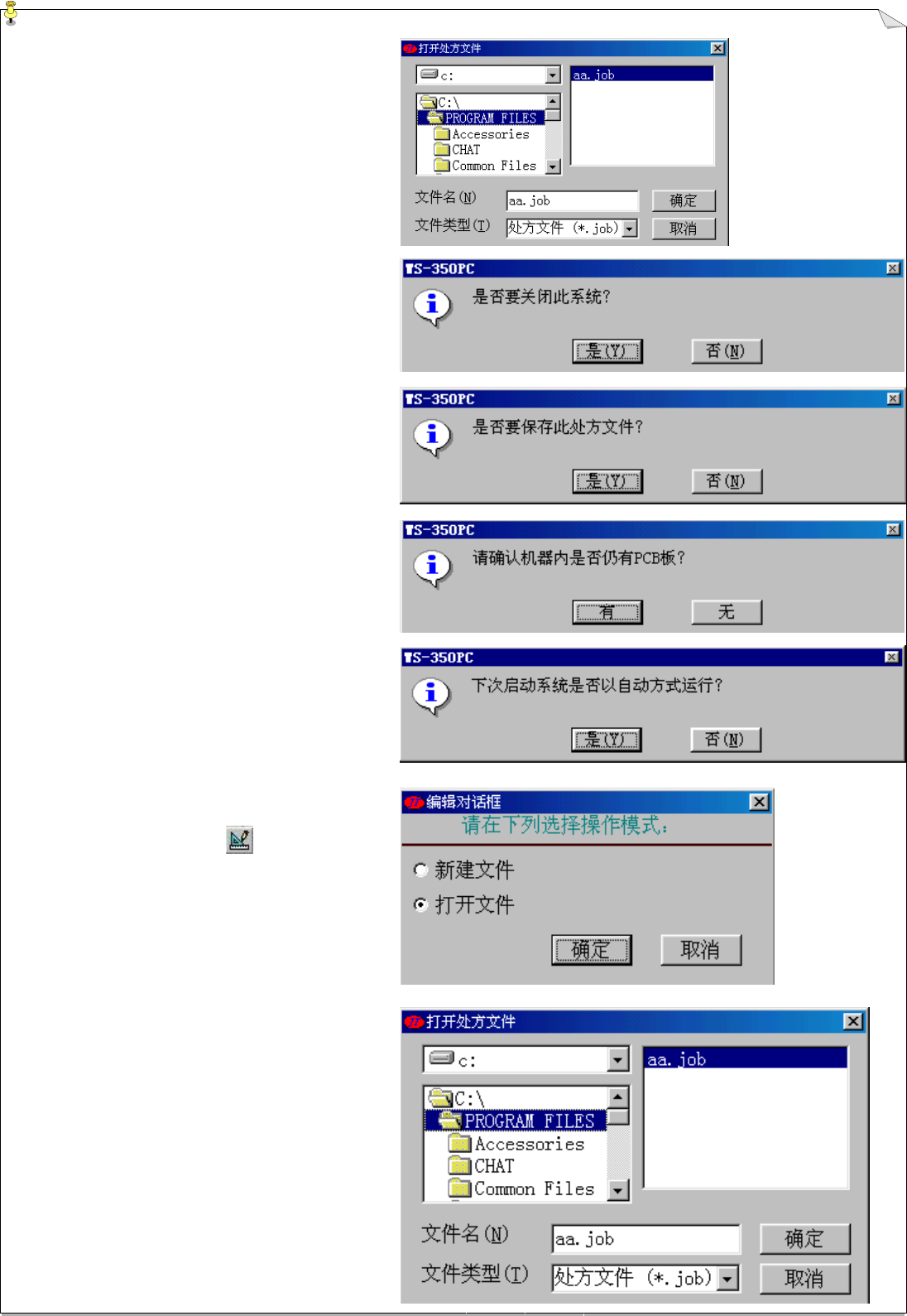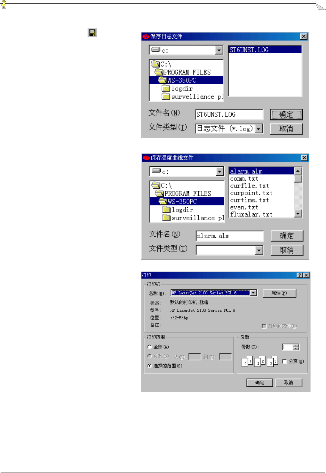 劲拓电子设备有 限公司 第 22 页 共 59 页 WS -350PC-B 型全电脑 控制双波峰焊锡 机用户手册 5.4.2.3.6 打印处方文件 当选择此选项, 系统将显示如右图 的” 打开处方文件 “对话框, 用户在” 文 件名 “栏中输入 所要打开的文件名或 在文 件框中单击该文 件,然后按” 确定 “ , 系统弹出如右上 图打印对话框, 要求 用户 选择打印机并确 认, 按 “ 确定 ” 钮系统便 打印此日志文件 , 按 “取消…