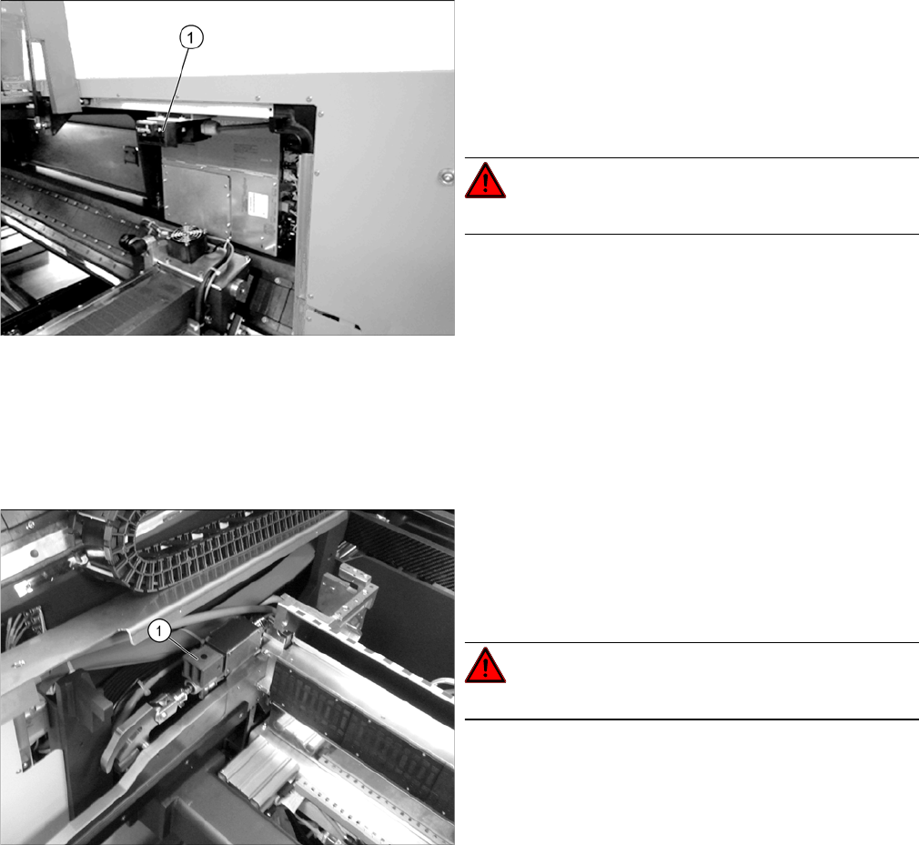 大修 5.2.2 执行维护工作 贴片机主体的维护工作 预防性维护 SIPLACE SX1/SX2 V2 37 减震器上的安全开关 监控抛料仓 ► 移出元件抛料仓 (2) 。控制面板上应立即出现一条消 息。 ► 重新插入元件抛料仓。 ► 为所有抛料仓重复此程序。 提示 仅有第 2 与第 4 部分的减震器才配有安 全开关。 ► 检查第 2 部分减震器上的安全开关: 将两个螺钉 (1) 拧松,将保护盖 (2) 固定牢固并将其 摆动至一侧。 将…