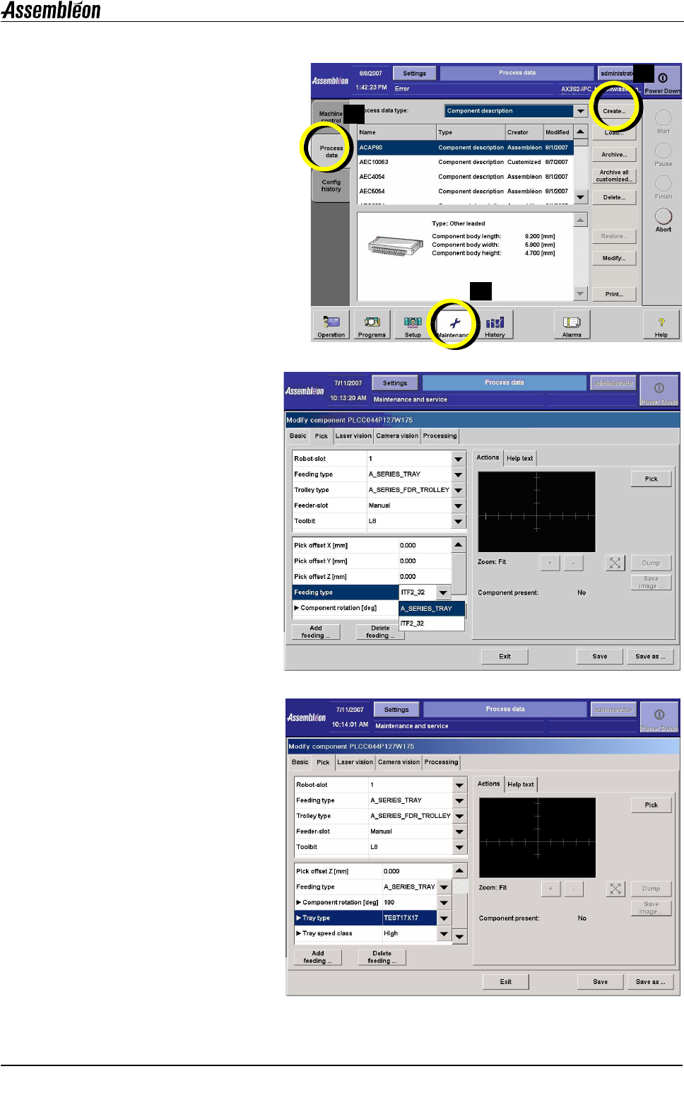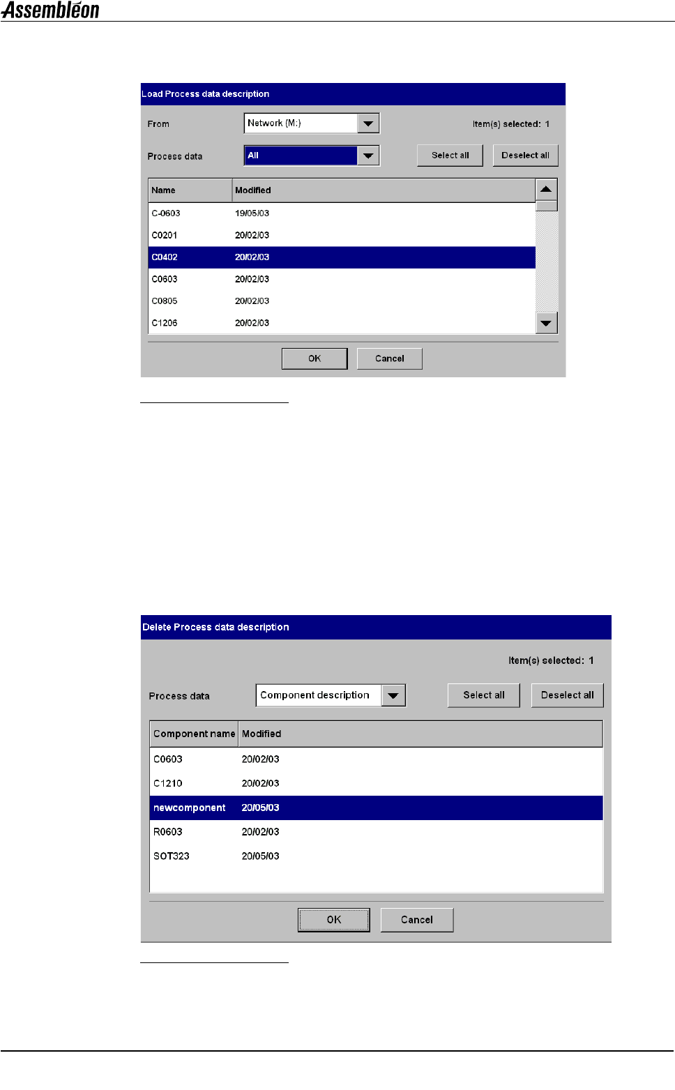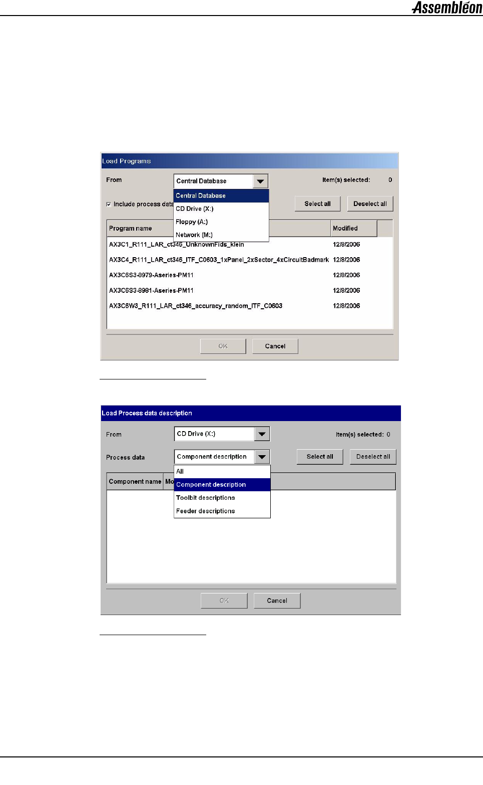 第 C3 章 用户参考手册 4022 593 52681 100 AX-301/501 , AX-3/5 08.01 处理数据 (元件、供料器和吸嘴) Process data loading and deleting.fm C3.2 载入新元件、供料器或吸嘴 要将新描述载入机器: • 选择 “维护 ( Maintenance ) ”。 • 选择 “处理数据 ( Process dat a )” 。 • 选择 “载入 ( Load ) …