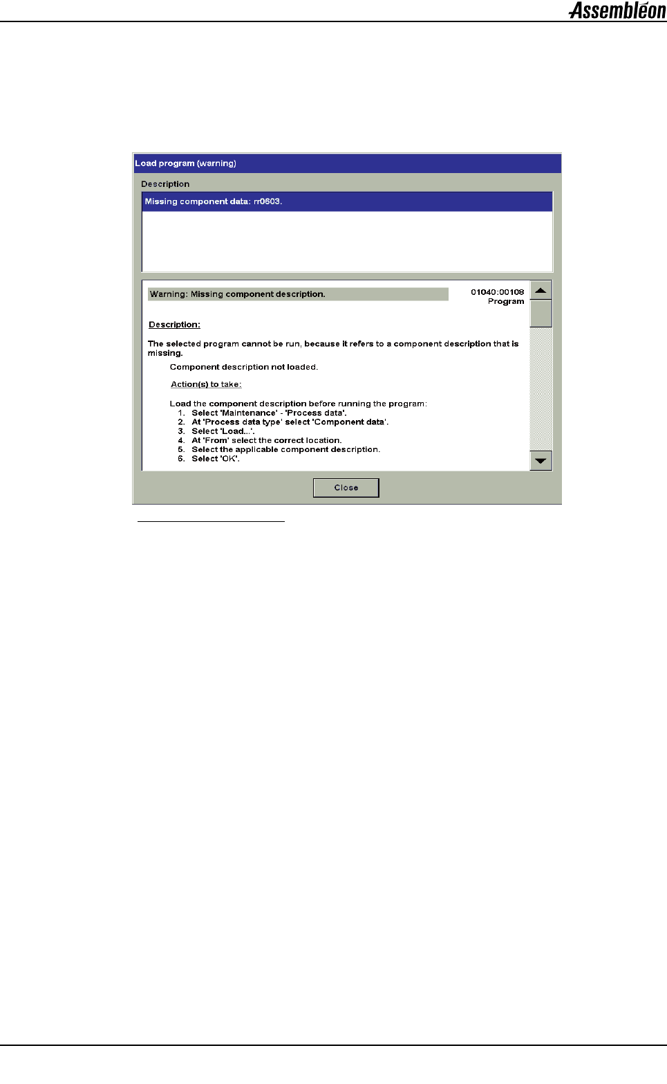 第 A4 章 用户参考手册 4022 593 52681 20 AX-301/501 , AX-3/5 08.01 应用 New place ment prog ram.fm A4.1.1 载入贴片程序时的错误信息 如果载入操作中有错误发生, 可读取错误信息以了解详 情。 语法错误必须由创建 了贴片程序的生产准备软件来 解决。 Q 缺少元 件时的错误信息 图 19 缺少元件可能显示的错 误信息 此时错误 “缺少元件描述 ( Missin…