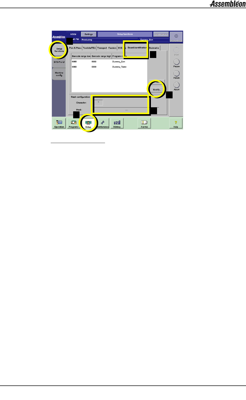 第 A5 章 用户参考手册 4022 593 52681 26 AX-301/501 , AX-3/5 08.01 应用 BI and BTCO setup.fm A5.2 定义条码和程序的关系 图 26 电路板识别码 1. 选择 “设置 ( Setup ) ” ( 1 ) - “设置功 能 ( Setup functions )” ( 2 ) - “电 路板识别码 ( Board identification ) ”( 3 ) 。 2…
