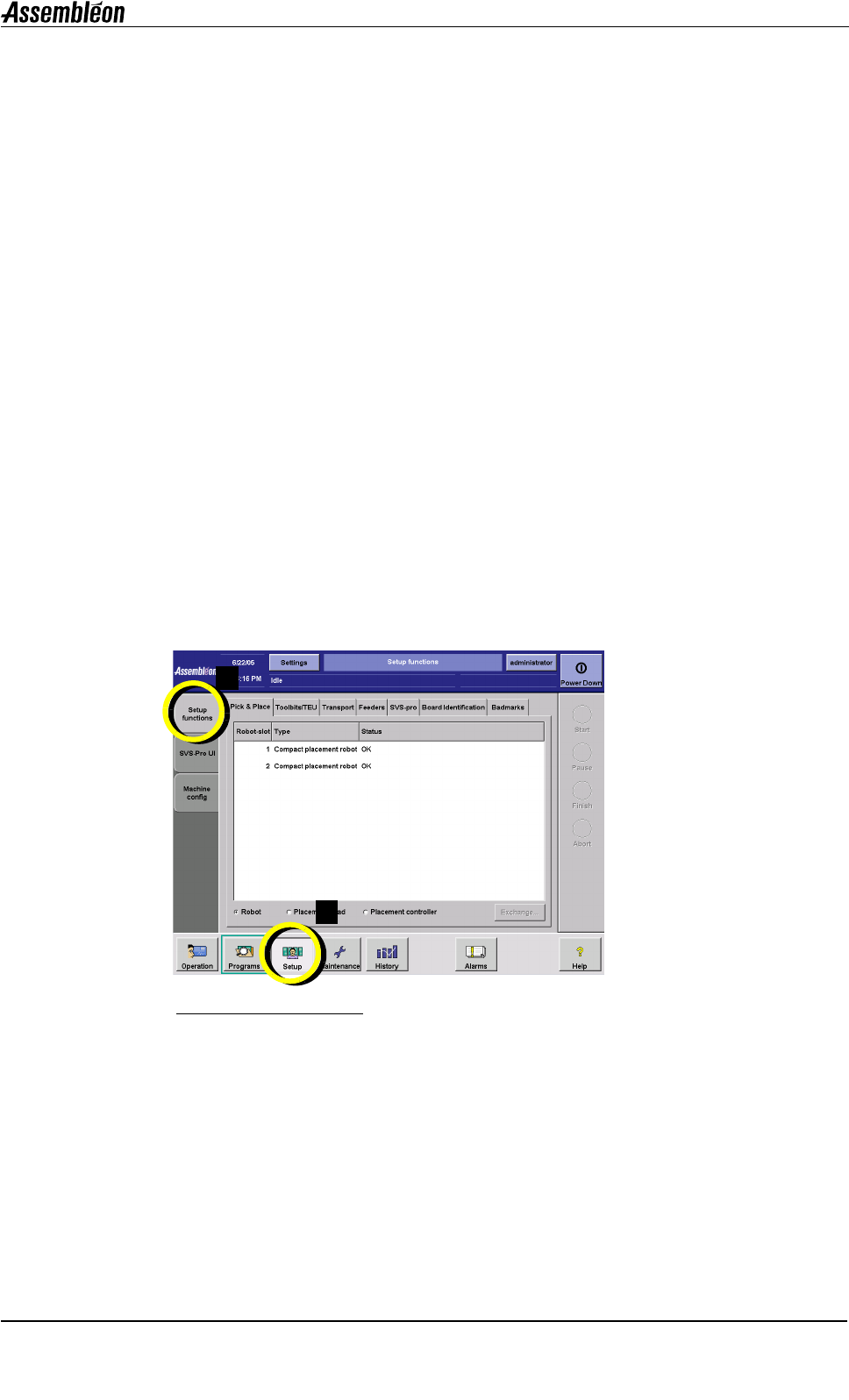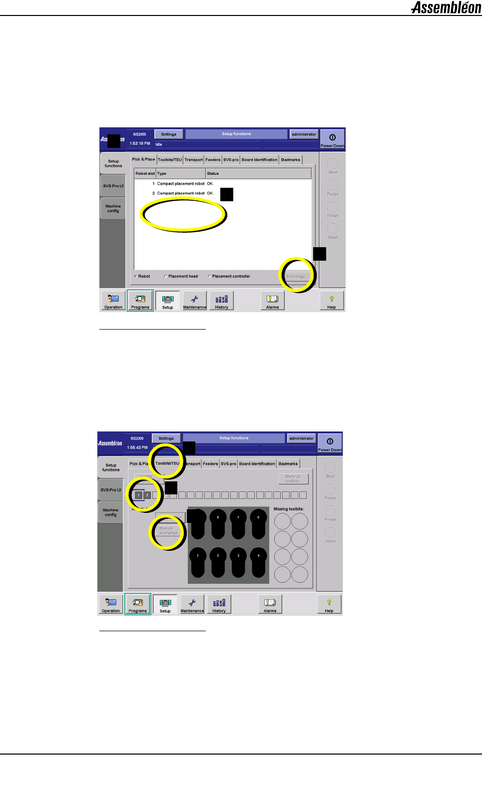 第 A6 章 用户参考手册 4022 593 52681 34 AX-301/501 , AX-3/5 08.01 应用 Machine setup.fm A6.1.2.1 设置拾取和贴片模块 1. 选择 “拾取和贴片 ( Pick & Place )” 。 机械臂状态为 “不良 ( NOK )” 时 : 2. 选择可用的机械臂。 3. 选择 “切换 ( Exchange ) ”来 更改设置。 图 41 拾取和贴片的设置功能 A…