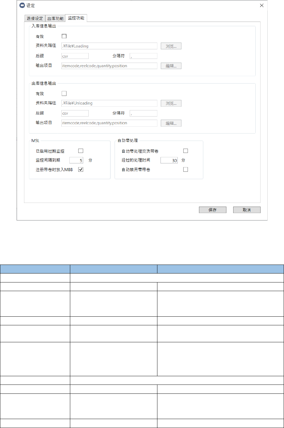 ISM Connect ion 使用说明书 3 设置 3-8 项目名称 初始设置值 内容 分隔符 ,( 逗号 ) 输出项目的分隔 字符 ※不可输入除 T ab[ \ t] 之外包含 \ 的字符 输出列 itemcode, reelcode,qu antity , position 输出带卷信息的 项目 按 下「 编辑…」 按钮, 打开输 出项目编辑 画 面。 按下项目按钮, 则 插入 在输出项目 设定处。 MSL 已启用过期 监控 无效…