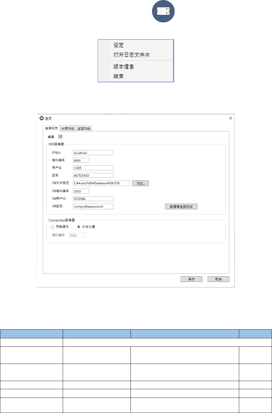 ISM Connect ion 使用说明书 3 设置 3-3 3-3-2 Connection 服务器的 设置 在编辑时,请参 考 初始设置值 仔细执行 操作 。 按照下述步骤启 动 Connect ion 服务器,打开设定 画面进行设 定。 在 启动器画面 点击 「 Connectio n 服务 器 」 按钮 。 图 3-3-1 启动器画面 ( 未启动 Connection 服务器 ) 启动 Connect ion 服务器 。 图 3…