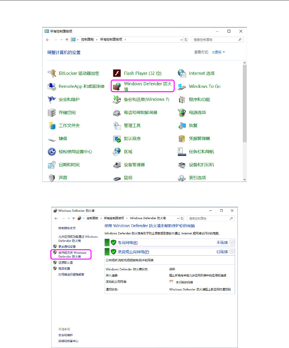 ISM Connect ion 使用说明书 3 设置 3- 19 3-4 Window s 防火墙的设置 请按照下述步骤 ,实施 ISM 服务器 PC 的 Wind ows 防火墙设置 。 (1) 点击 控制面板 的 [ Windo ws Defender 防火墙 ] 。 图 3-4-1 控制面板 (2) 点击 [ 启用或关闭 Windows Defender r 防火墙 ] 。 图 3-4-2 Windows De fender 防火…