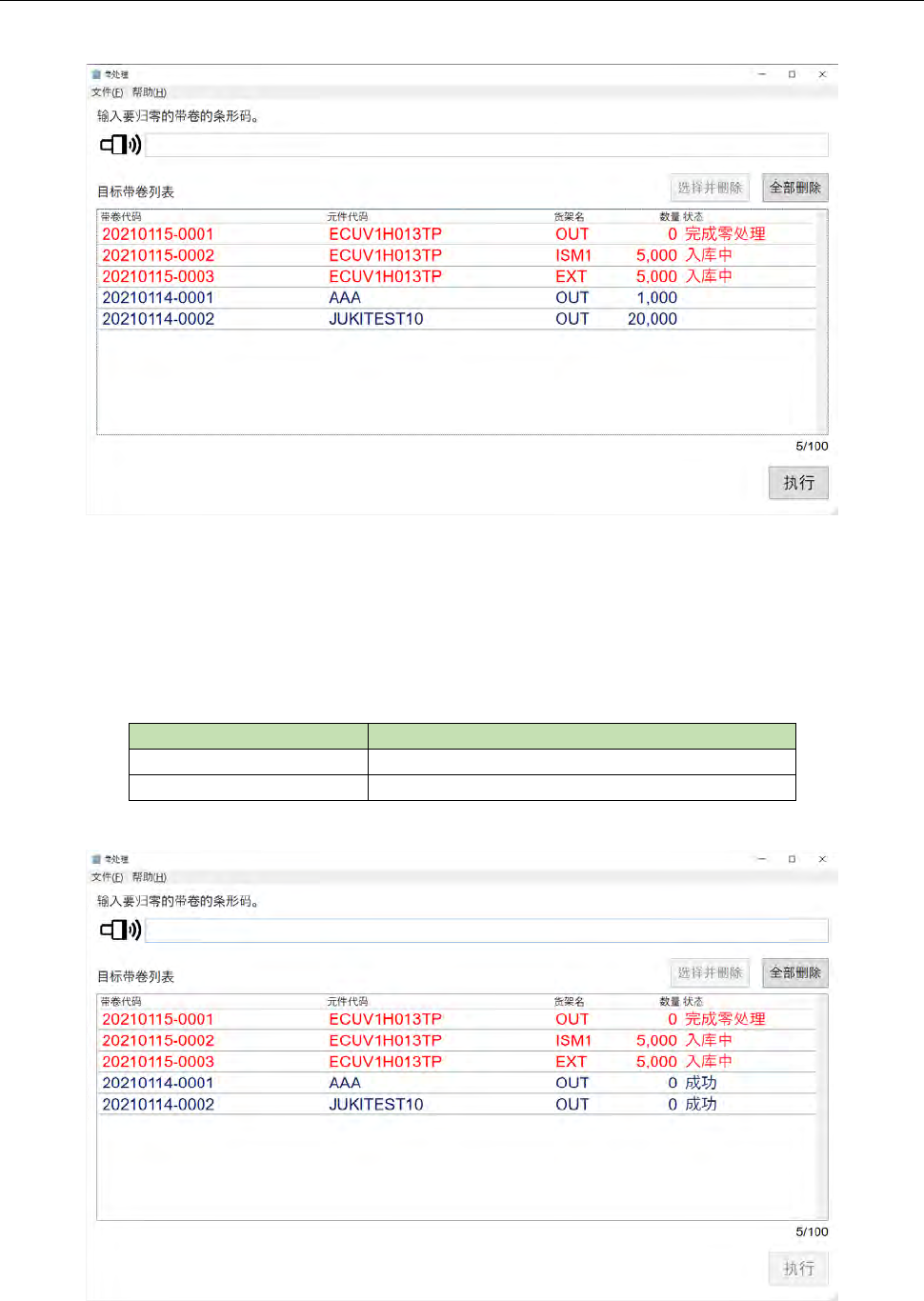 可执行零处理状态下的带卷显示为蓝字,不能执行零处理状态的带卷显示为红字。