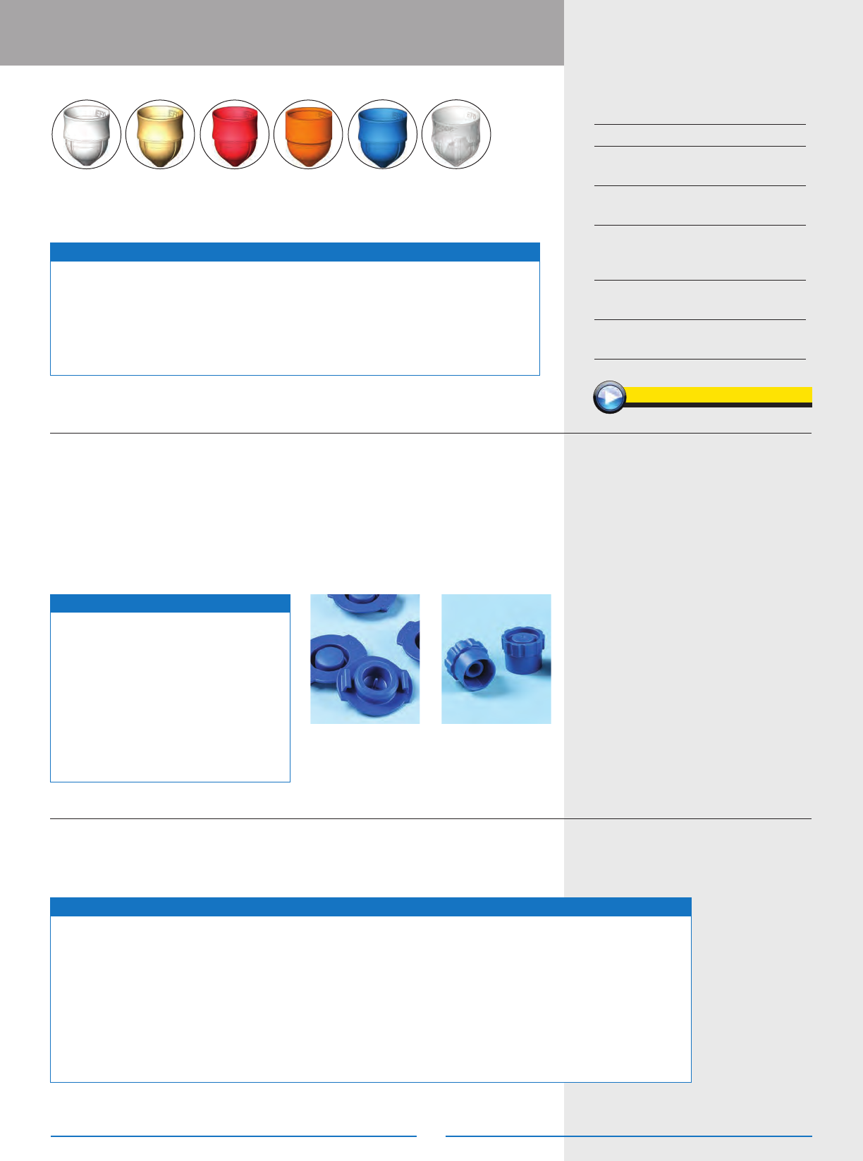 整体成型的乙缩醛套头。NBR O型圈、柔性聚亚胺酯气管、快速接头和安全夹装配而成的蓝色针筒适配器。适合各种普通应用。