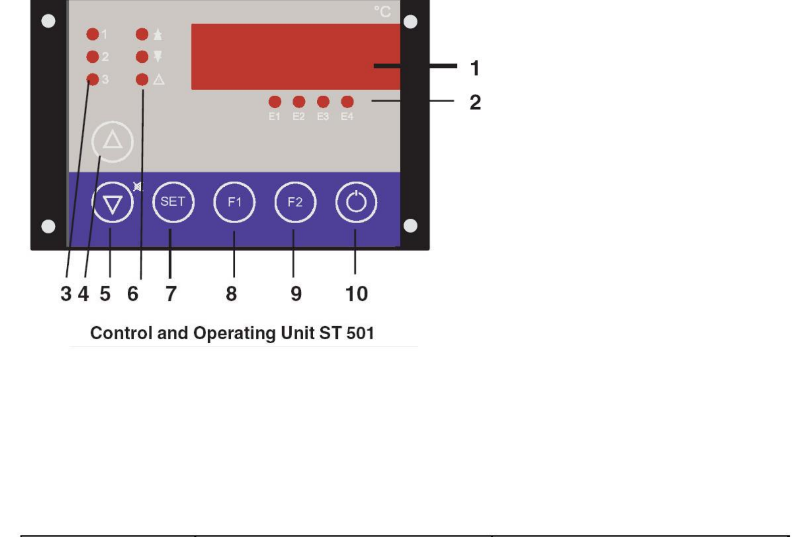 E2 高压状态 E3 低压状态 E4 压缩机和风扇状态 3 控制模式 1 水泵打开 2 控制设定1 打开 3 控制设定2 打开 4 上按钮 增加设定点或参数值 5 下按钮 降低设定点或参数值 6 报警显示 上健表示:上限值固定设定控制 下健表示 : 下限值固定设定控制 下健表示 : 下限值固定设定控制 7 设定 设定点调用或参数显示 8 F1按钮 参数后特别的功能促成 9 F2按钮 参数后特别的功能促成 10 Stand-by 按钮 控…