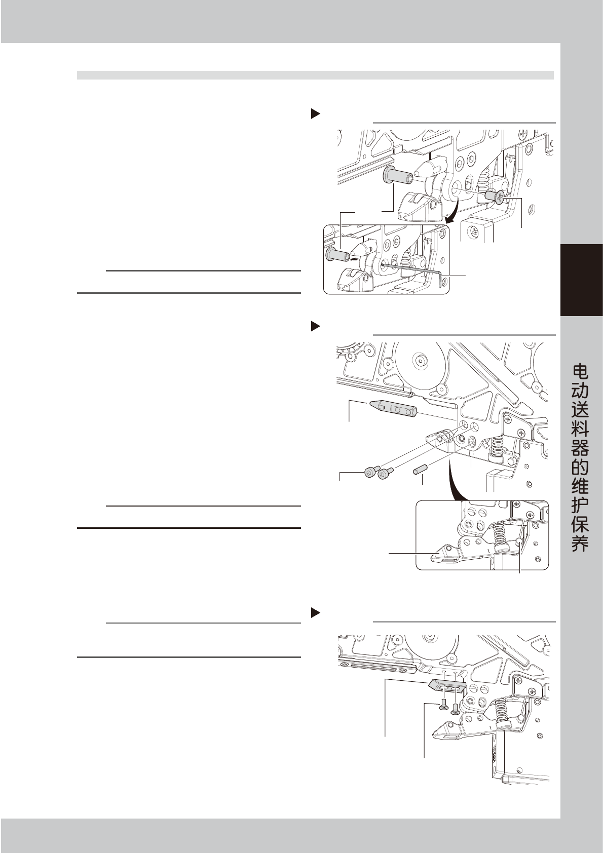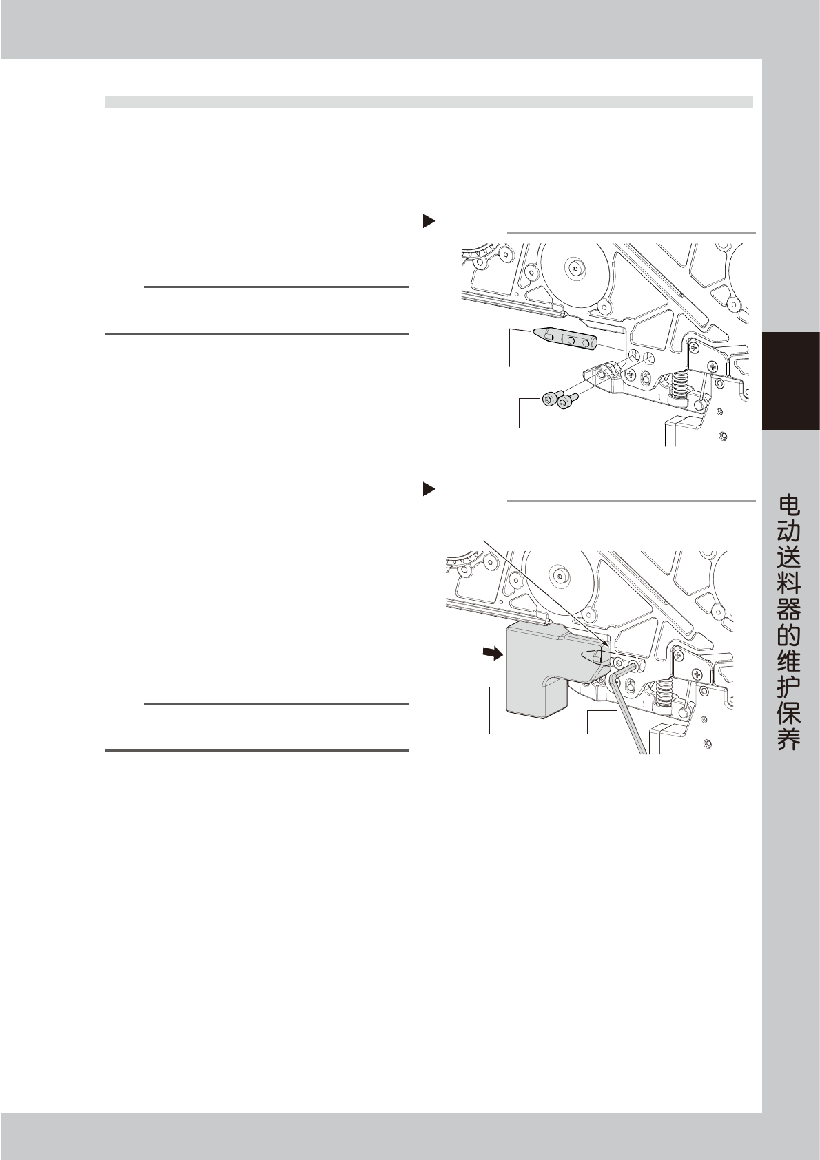 3-14 3 Z S ■不使用固定销安装工具时 1 拆卸固定销。 用内六角扳手 (2.5) 拆卸固定销的 2 根固定螺栓之 后,取下固定销。 参考 若底板也需要更换时,此时拆卸底板会更便于更换。  关于底板的更换方法,请参照本章后述 “3.7底板的更换” 。 2 换上新的固定销。 1. 将新的固定销插入送料器的固定销安装孔中, 并用 2 根固定螺栓进行预固定。 2. 边向右图所示箭头方向按住固定销,边用内六 角扳手 (2.5) …
