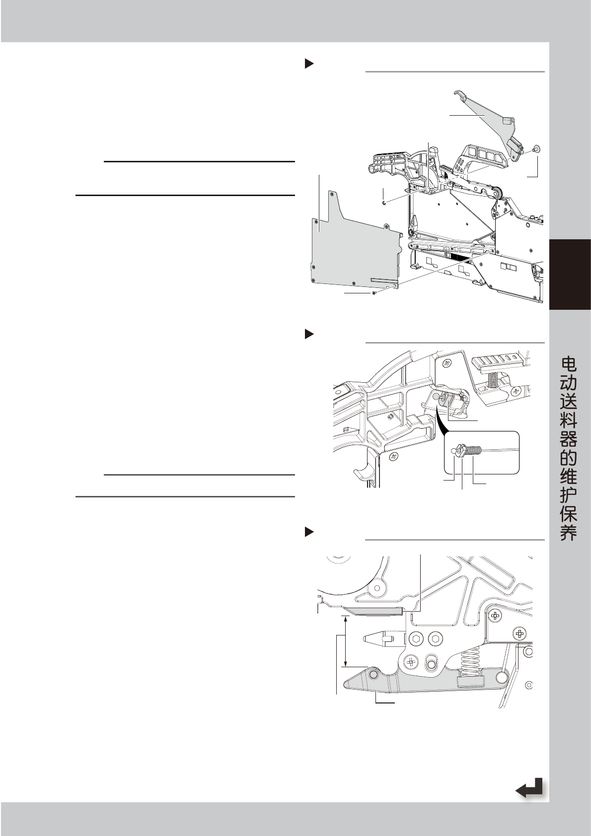 3-27 3 Z S 5 拆卸盖带回收盒的盖板、手柄杆。 1. 用十字螺丝刀 (No.1) 拆卸固定盖板的 7 颗螺钉。 2. 取下盖带回收盒的盖板。 3. 用精密一字螺丝刀拆卸 E 型圈。 4. 用精密螺丝刀等顶出铆钉。 5. 拆卸手柄杆。 c 注意 • 拆卸 E 型圈时,请注意不要丢失。 • E 型圈为专用配件,万一丢失,请勿使用非指定的 E 型圈。 6 换上新的手柄杆,并安装盖带回收盒的 盖板。 1. 将新的手柄杆安…