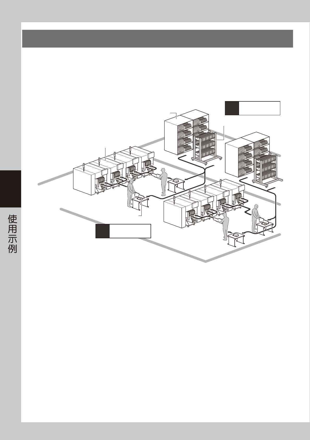 根据选配装置 ( 上料台和离线上料台 ) 的配备台数与工厂布局的不同,使用方法存在很大差异。上述示例仅供参考。