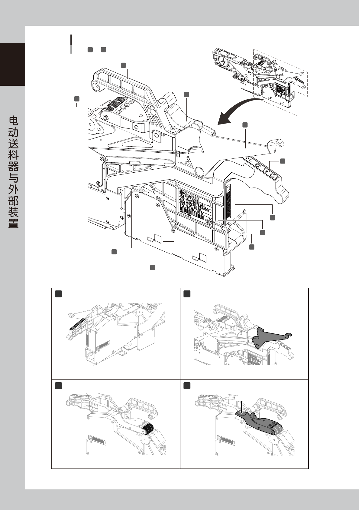 1-1 1 1 Z S 3 链齿轮 4 前端固定块 两侧都有链齿轮 链齿轮的齿与料带的走带孔咬合,按照指定的间距传送料带。 32mm 〜 104mm 的 ZS 电动送料器两侧都有链齿轮 ( 称为“双 链齿轮” ) ,可以稳定地传送大型元件。 安装送料器时插入送料器架侧进行固定。 5 导条 6 固定销 安装送料器时防止送料器上浮。 安装送料器时插入送料器架侧进行固定。 7 锁定杆 8 钢丝 锁定杆 手柄杆 钢丝 通过开、关锁定杆安装或拆卸…