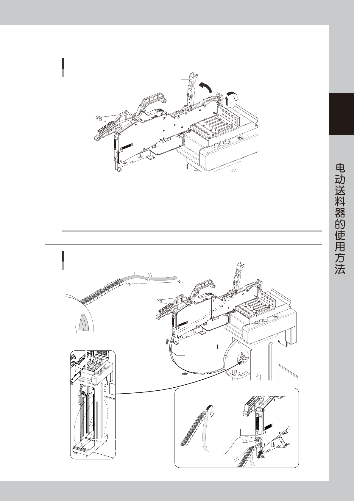 将带装元件装入 ZS 电动送料器 ( 简称“送料器”),需要使用上料台或离线上料台或装有料车用电源的一次性换