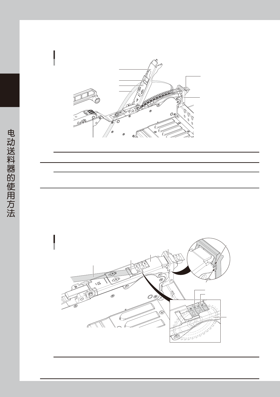 将盖带穿过压料盖切口部的方法有“预先剥离”和“前端剥离”两种方法。详细内容,请参照本章后述“3.1.1盖带的预先剥离与
