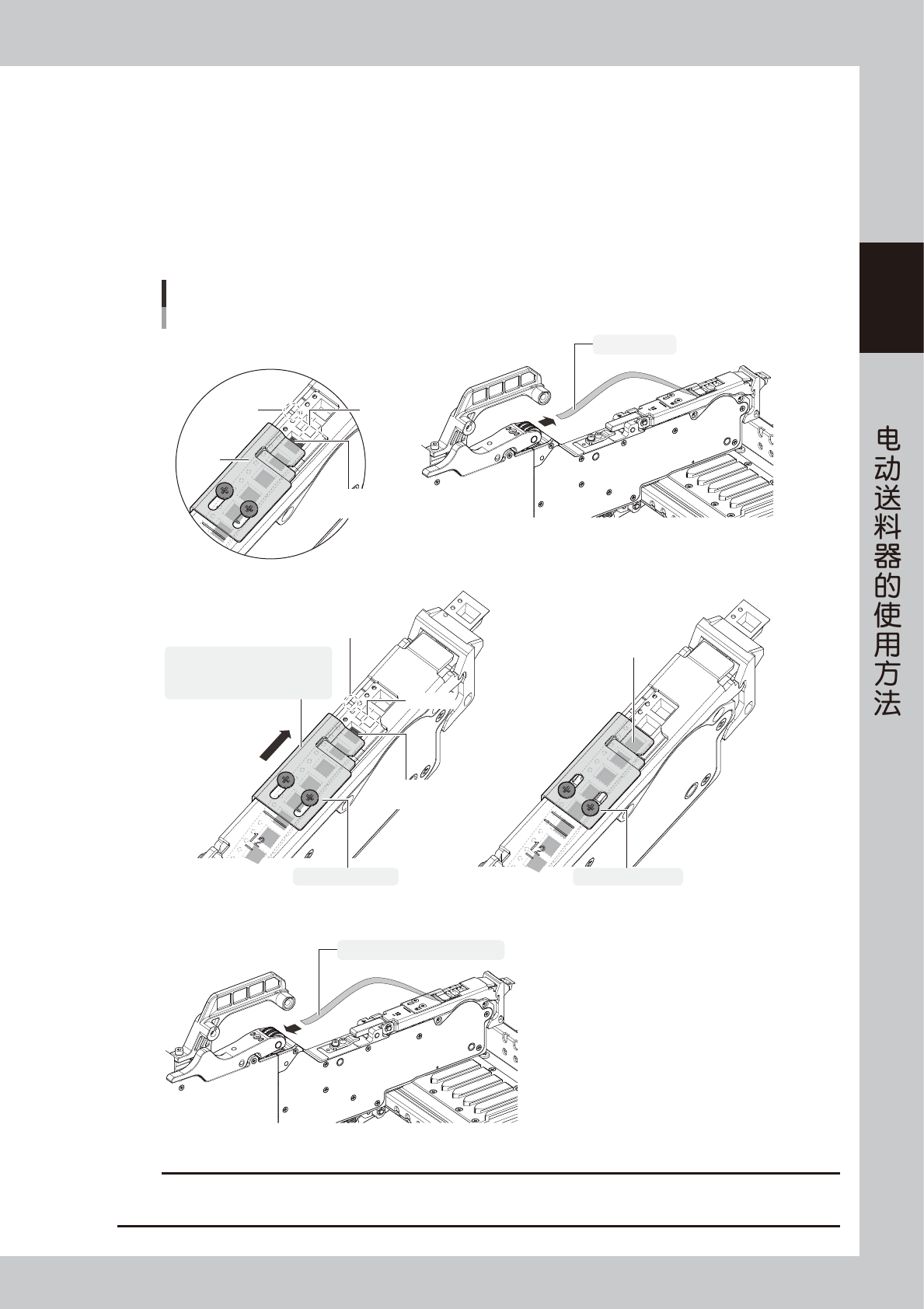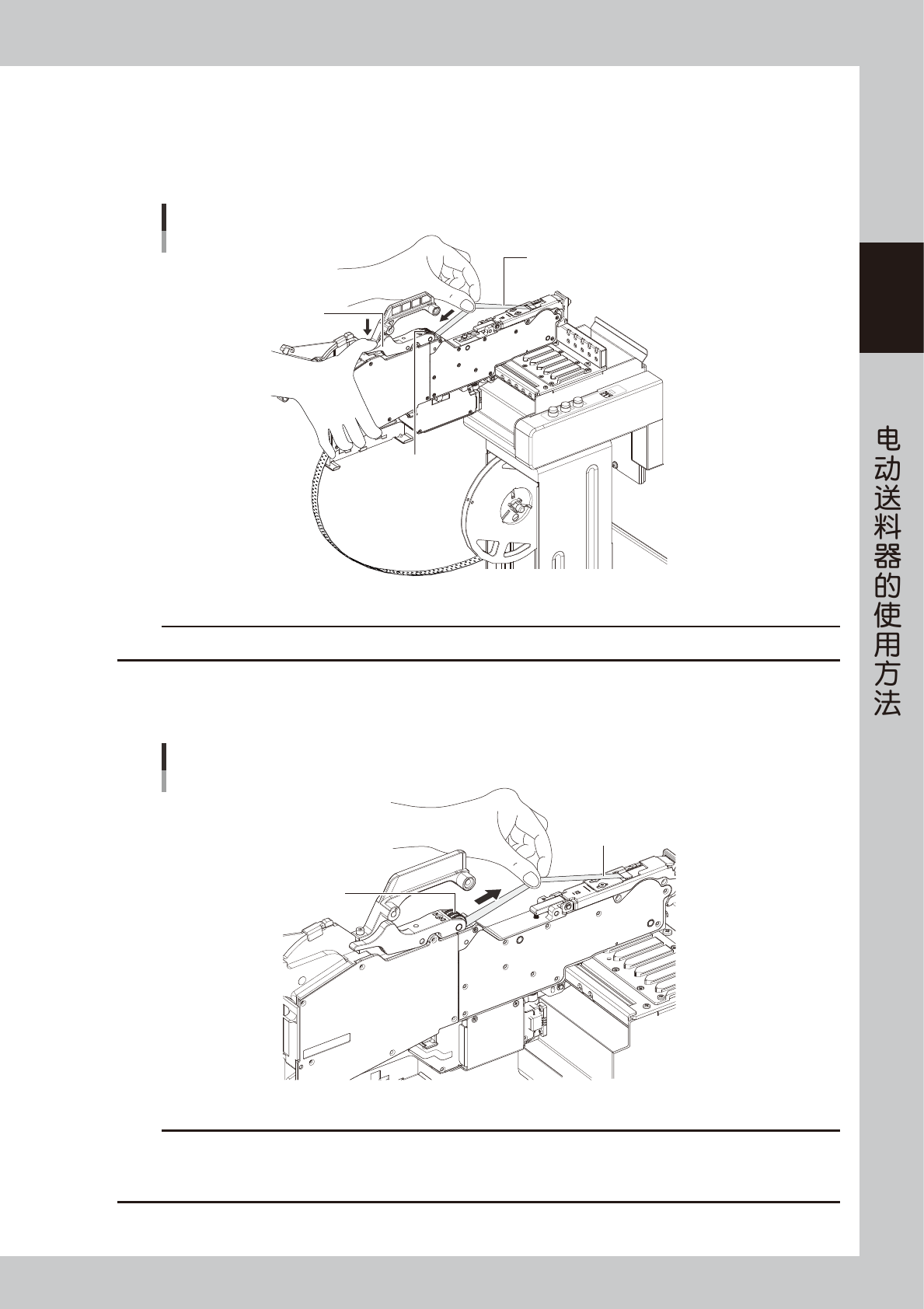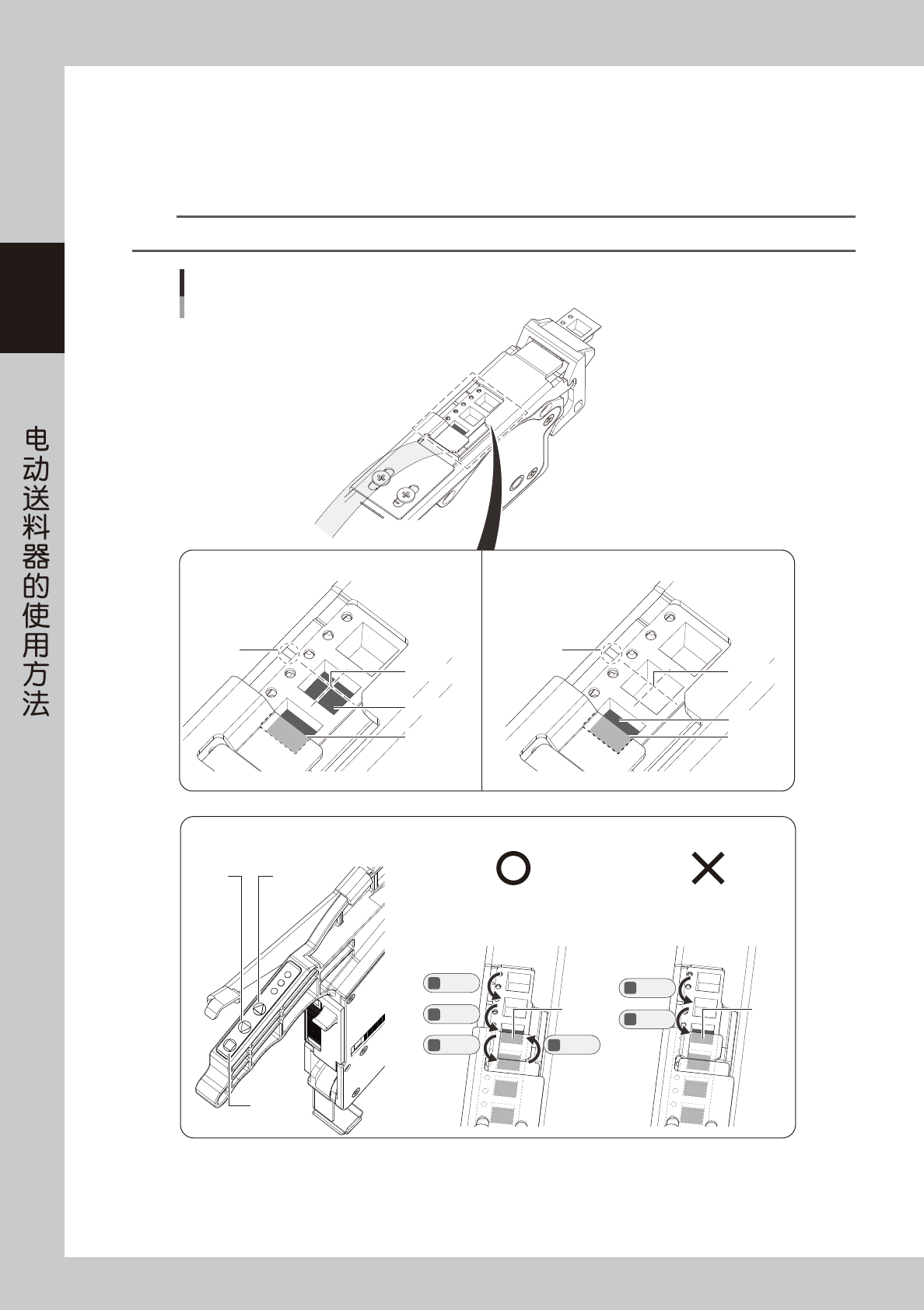 2-14 2 Z S 9 将最前端的元件对准待机位置。 按 ZS 电动送料器上的 [FEED]、[BACK] 按钮,可以使料带向前或向后走带。 1. 按 [FEED] 按钮,将最前端的元件传送到吸料位置 ( 标记处 )。 2. 按 2 次以上 [BACK] 按钮使元件被退回之后,按 1 次 [FEED] 按钮使最前端的元件对准待机位置。 n 要点 边按 ZS 电动送料器的 [FUNC] 按钮,边按 [FEED] 或 [BACK] 按钮…