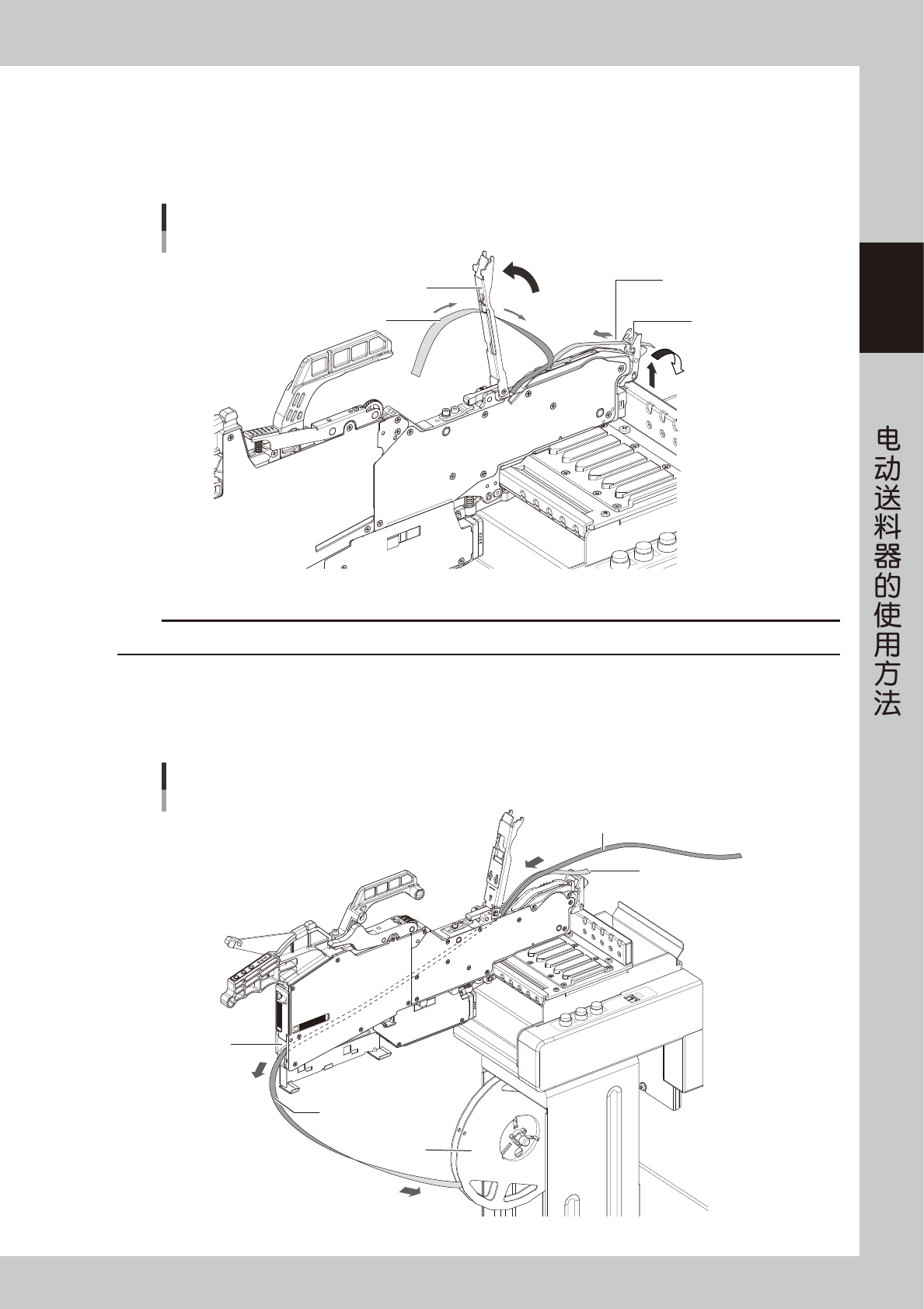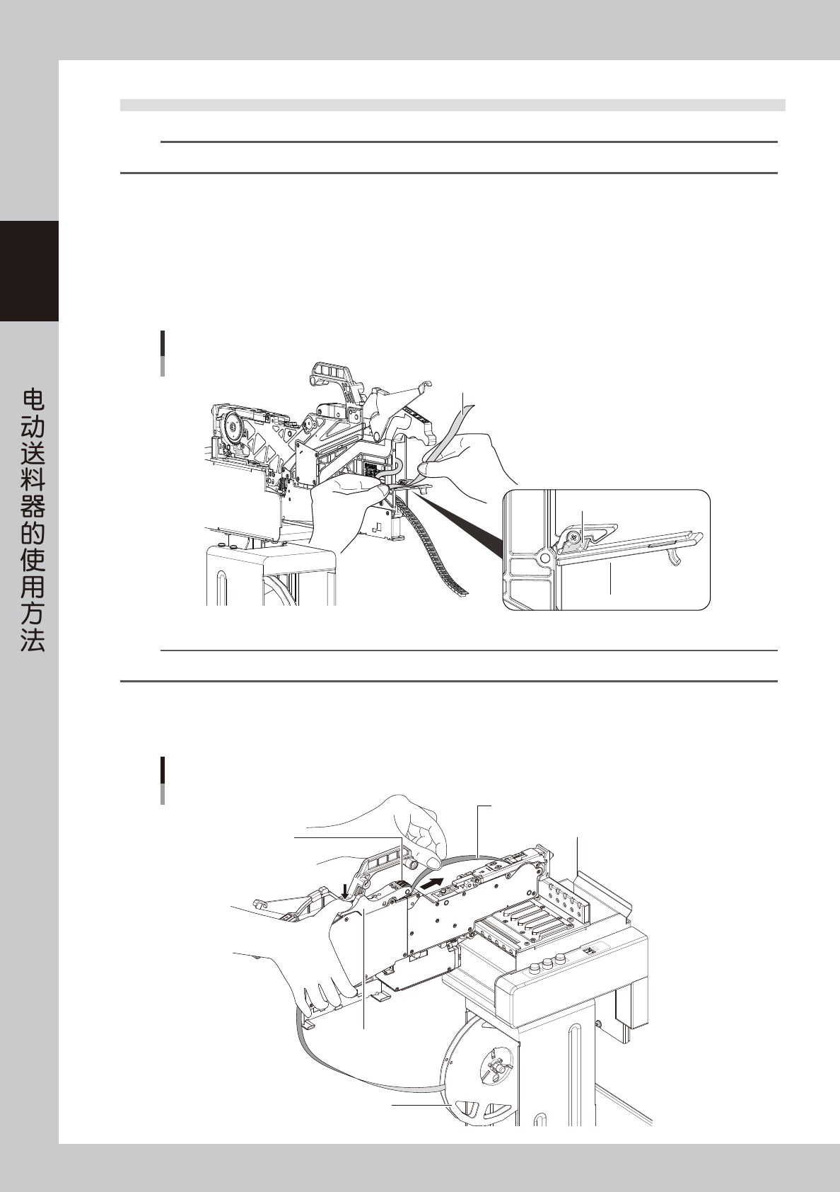 2-19 2 Z S 4 提起压料盖。 1. 将前端压料扣边向上提起边向前拉开之后,提起压料盖。 2. 将盖带从压料盖中抽出。 3. 将载带从前端压料扣中抽出。 提起压料盖 压料盖 前端压料扣 抽出载带 抽出盖带 65214-KLJ-00 c 注意 抽出盖带时,请勿强行抽出,以免使压料盖变形引起吸料不良。 5 将带装元件从送料器中拆出。 1. 从送料器尾部的料带插入口中抽出料带。 2. 转动料带盘,卷取料带。 拆卸带装元件 带装元件 …